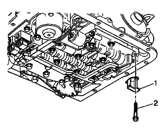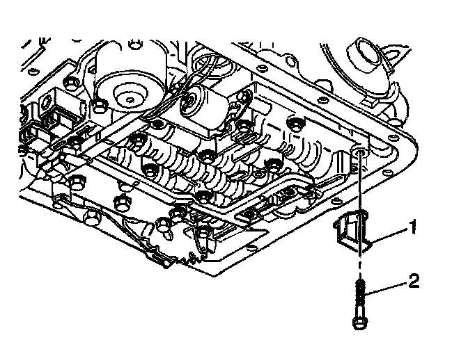 17. Install the transmission fluid indicator stop bracket (1) and bolt (2).