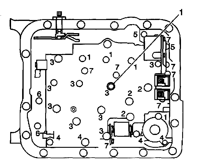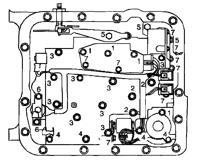 5. Do not install the transmission fluid indicator stop bracket and bolt at this time. Install but do not tighten the control valve body bolts, which retain only the valve body directly. Each numbered bolt location corresponds to a specific bolt size and length, as indicated by the following: