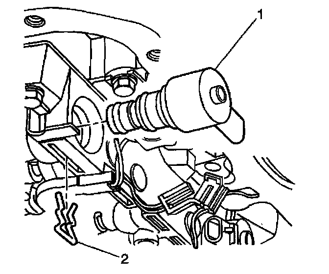 8. Remove the TCC PWM solenoid retainer (2) with a small screwdriver. Rotate the solenoid (1) in the bore, if necessary, until the flat part of the retainer (2) is visible.