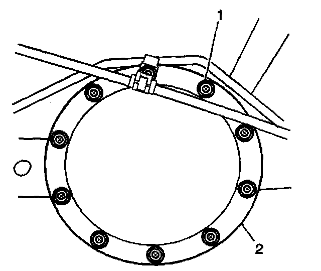 39. Install the rear axle housing cover bolts (1).