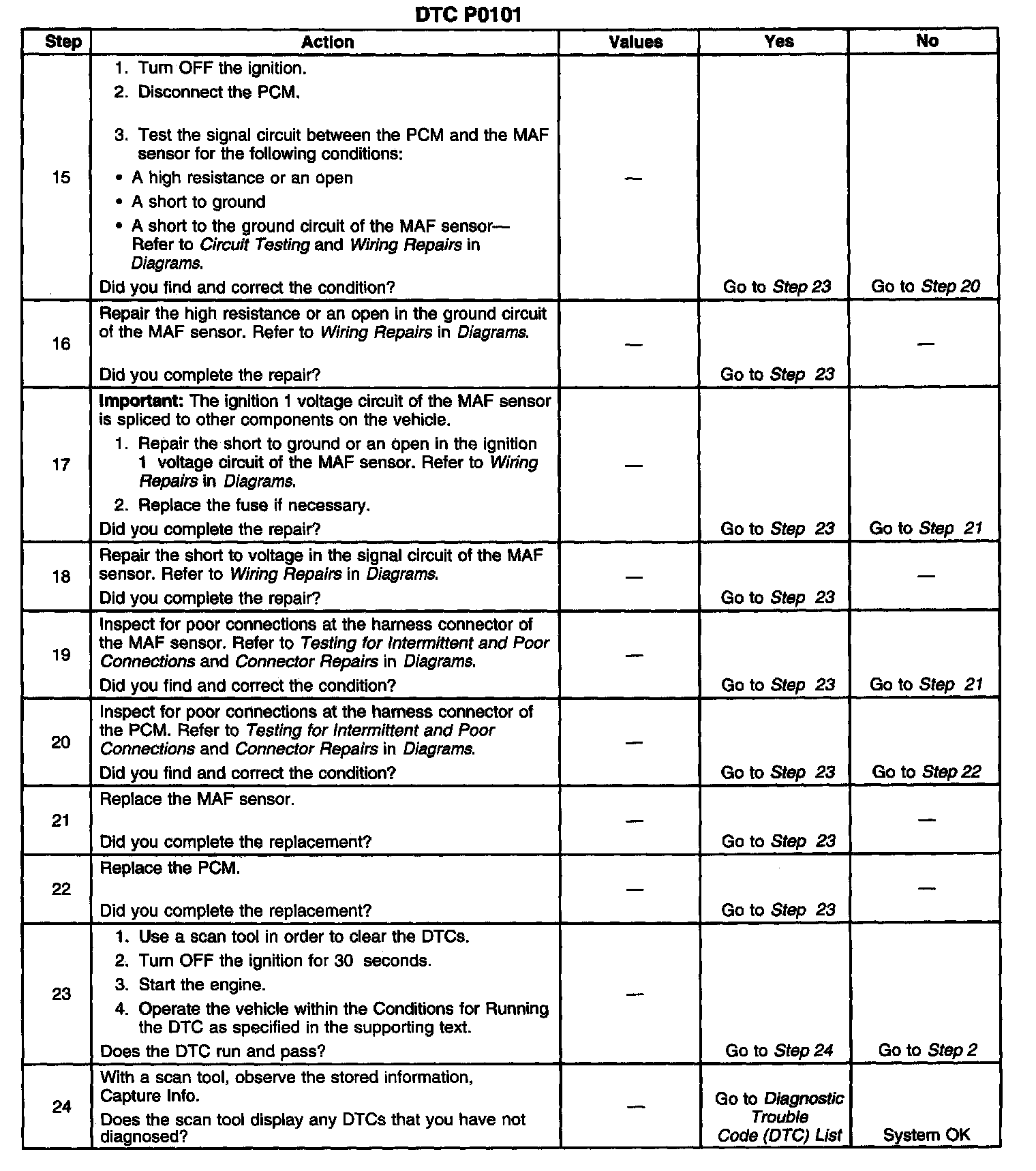 CIRCUIT DESCRIPTIONThe Mass Air Flow (MAF) sensor is an air flow meter that measures the amount of air entering the engine. The Powertrain Control Module (PCM) uses the MAF sensor frequency signal in order to provide the correct fuel delivery for a wide range of engine speeds and loads. A small quantity of air entering the engine indicates deceleration or idle. A large quantity of air entering the engine indicates an acceleration or high load situation. The MAF sensor has an ignition 1 voltage circuit, a ground circuit and a signal circuit. The PCM applies a voltage to the sensor on the signal circuit. The sensor uses the voltage in order to produce a frequency based on inlet air flow through the sensor bore. The PCM uses the Barometric Pressure (BARO) at key ON, and the engine RPM in order to calculate a predicted MAF value. The PCM compares the actual MAF sensor frequency signal to the predicted MAF value in order to determine if the signal is stuck based on a lack of variation, or is too low or too high for a given operating condition. Diagnostic Trouble Code (DTC) P0101 will set if the actual MAF sensor frequency signal is not within a predetermined range of the calculated MAF value.