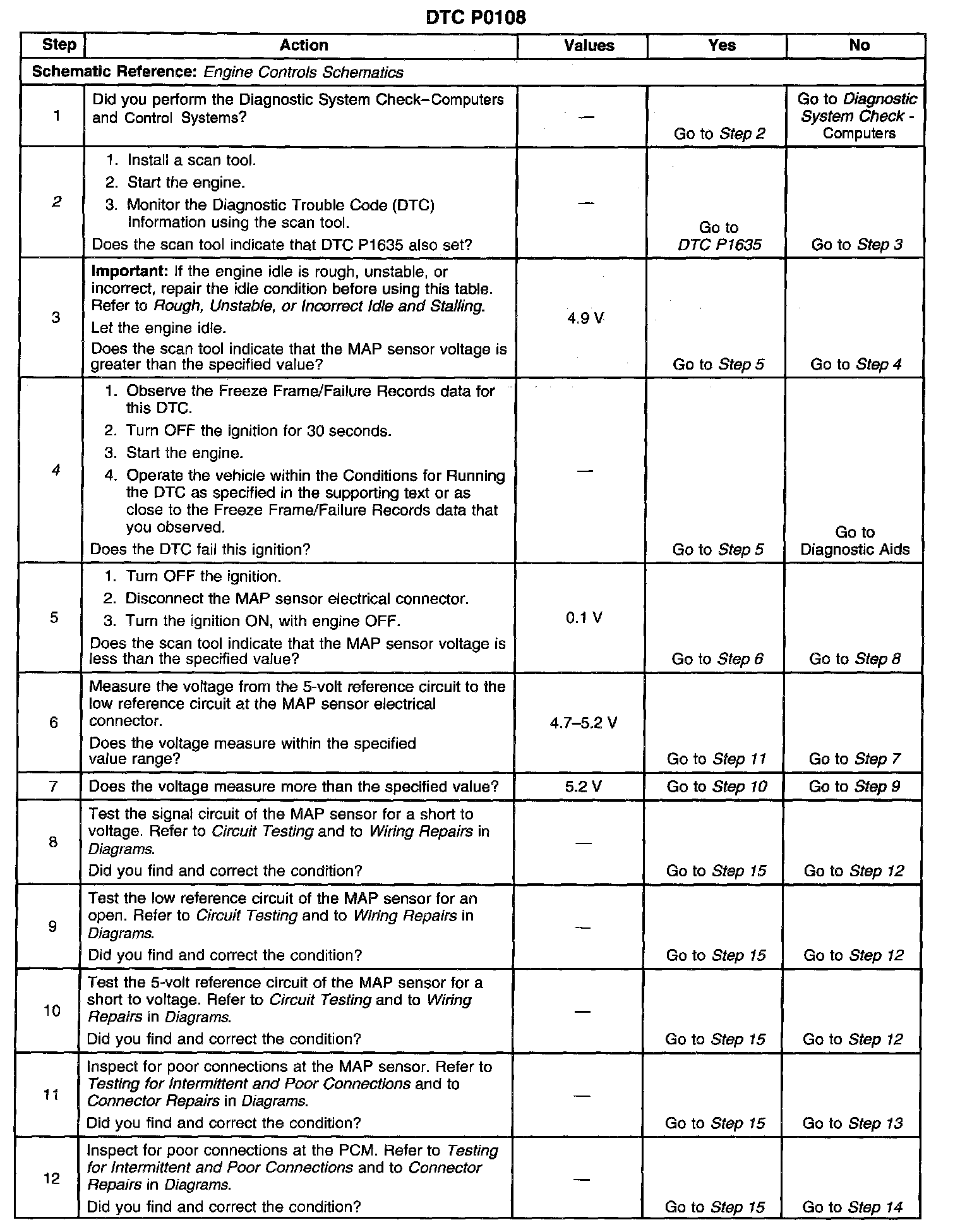 2. The MAP sensor 5-volt reference circuit is shared with other sensors. If DTC P1635 is set, this indicates that the 5-volt reference circuit is either shorted to ground or shorted to voltage and should be diagnosed first. The short may be on another sensors 5-volt reference circuit.