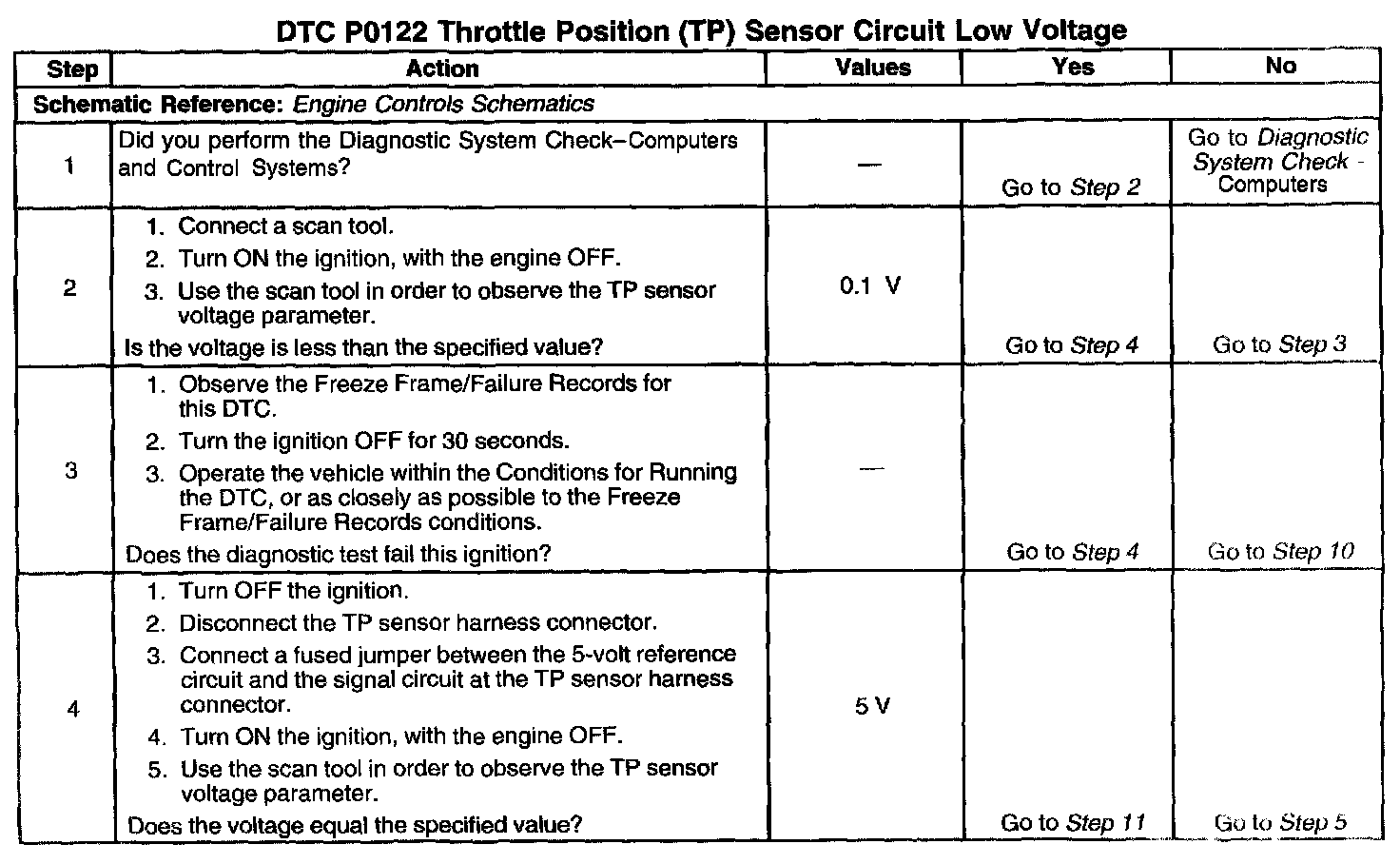The PCM provides the TP sensor with a 5-volt reference circuit and a low reference circuit. Rotation of the TP sensor rotor from the closed throttle position to the Wide Open Throttle (WOT) position provides the PCM with a signal voltage from less than 1 volt to more than 4 volts through the TP sensor signal circuit. If the PCM detects an excessively low signal voltage, this Diagnostic Trouble Code (DTC) will set.