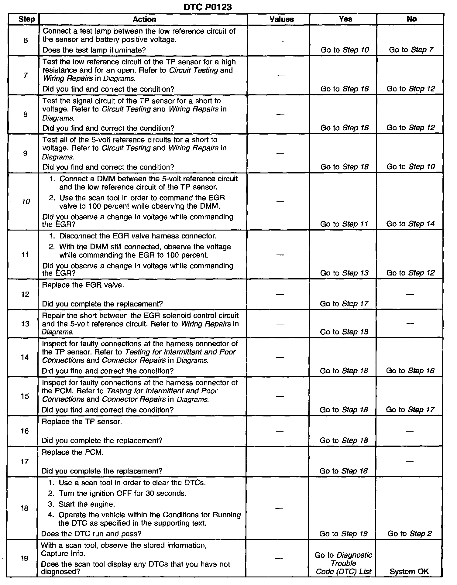 CIRCUIT DESCRIPTIONThe Throttle Position (TP) sensor is used by the Powertrain Control Module (PCM) to determine the throttle plate angle for various engine management systems. The TP sensor is a potentiometer type sensor with a 5-volt reference circuit, a low reference circuit, and a signal circuit. The PCM provides the TP sensor with a 5-volt reference circuit and a low reference circuit. Rotation of the TP sensor rotor from the closed throttle position to the Wide Open Throttle (WOT) position provides the PCM with a signal voltage from less than 1.0 volt to more than 4.0 volts through the TP sensor signal circuit. If the PCM detects an excessively high signal voltage, This Diagnostic Trouble Code (DTC) will set.
