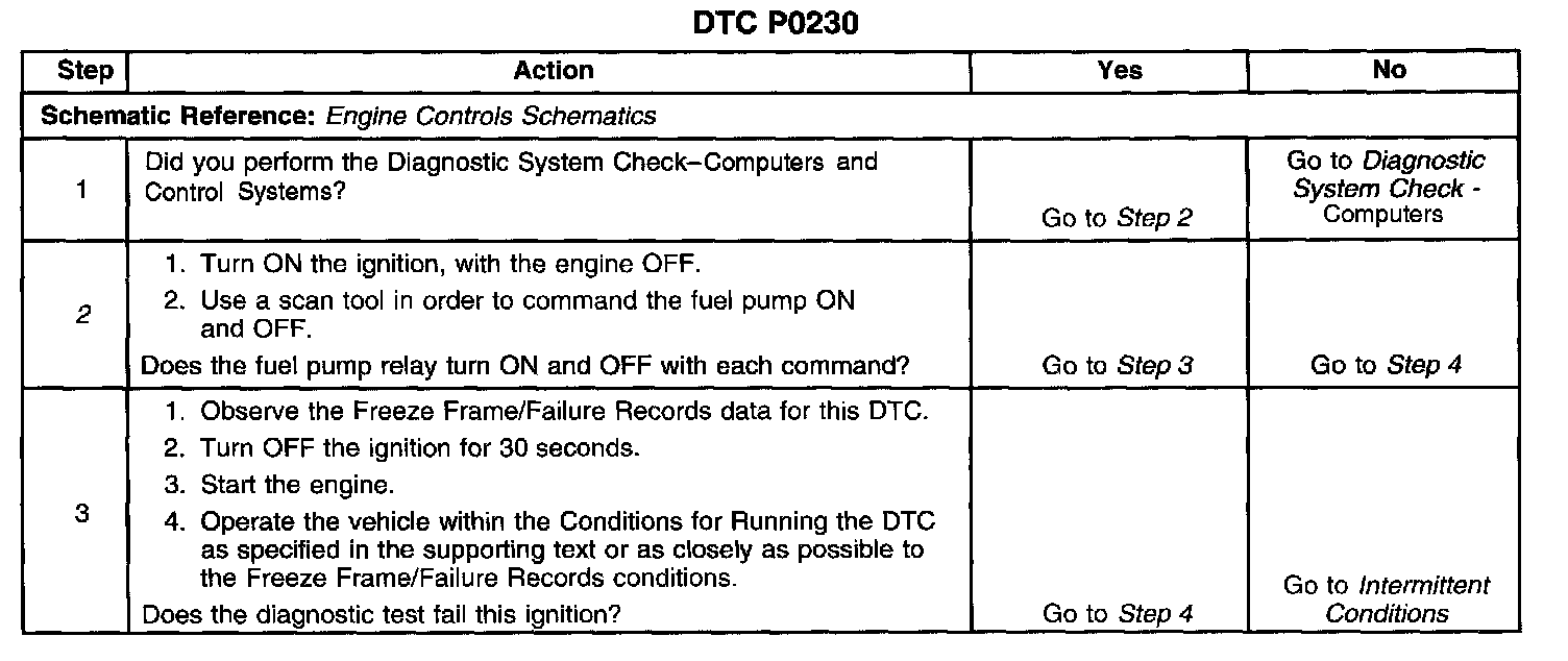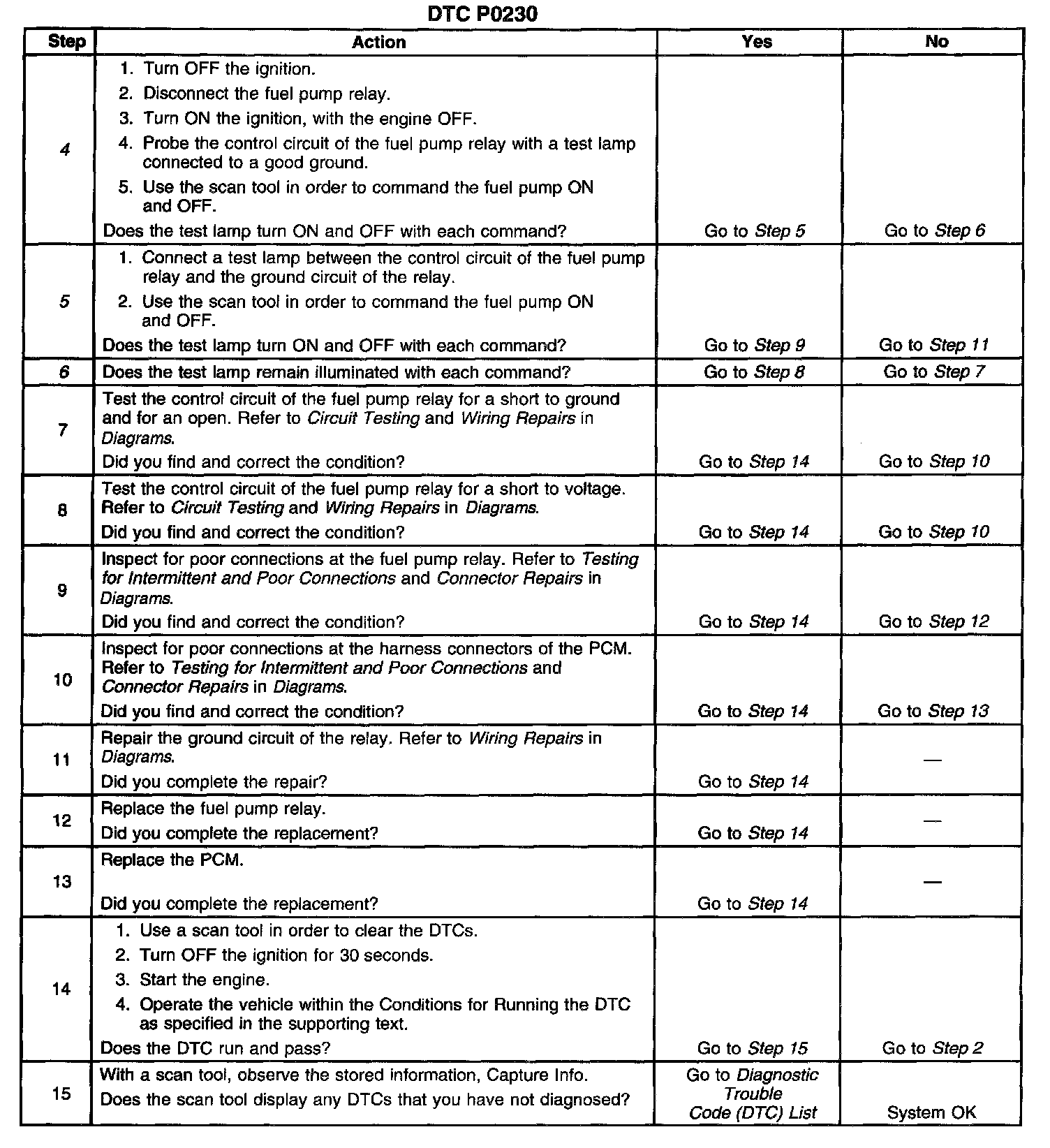 CIRCUIT DESCRIPTIONThe Powertrain Control Module (PCM) provides ignition positive voltage to the coil side of the fuel pump relay. When the ignition is first turned ON, the PCM energizes the fuel pump relay, which applies power to the fuel pump. The PCM enables the fuel pump relay as long as the engine is cranking or running, and crankshaft reference pulses are received. If no crankshaft reference pulses are received, the PCM de-energizes the fuel pump relay after 2 seconds. The PCM monitors the voltage on the fuel pump relay control circuit. If the PCM detects an incorrect voltage on the fuel pump relay control circuit, Diagnostic Trouble Code (DTC) P0230 sets.