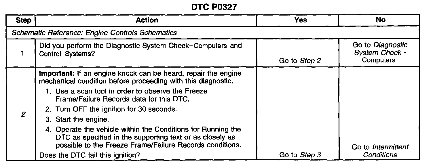 CIRCUIT DESCRIPTIONThe Knock Sensor (KS) produces an AC voltage at all engine speeds and loads. The Powertrain Control Module (PCM) then adjusts the spark timing based on the amplitude and the frequency of the KS signal. The PCM uses the KS signal to calculate the average voltage. Then the PCM assigns a voltage value. The PCM checks the KS and related wiring by comparing the actual knock signal to the assigned voltage range. A normal KS signal should stay within the assigned voltage range. This Diagnostic Trouble Code (DTC) will set if the KS signal is outside the assigned voltage range or not present.