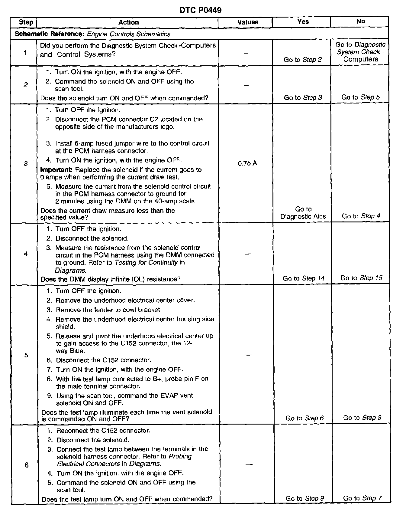 CIRCUIT DESCRIPTIONA voltage is supplied directly to the Evaporative Emission (EVAP) vent valve solenoid. The Powertrain Control Module (PCM) controls the solenoid by grounding the control circuit via an internal switch called a driver. The primary function of the driver is to supply the ground for the controlled component. Each driver has a fault line which the PCM monitors. The voltage of the control circuit should be low, near 0 volts, when the PCM commands a component ON. The voltage potential of the circuit should be high, near the battery voltage, when the PCM commands the control circuit to a component OFF. If the fault detection circuit senses a voltage other than what the PCM expects, the fault line status changes causing the Diagnostic Trouble Code (DTC) to set.