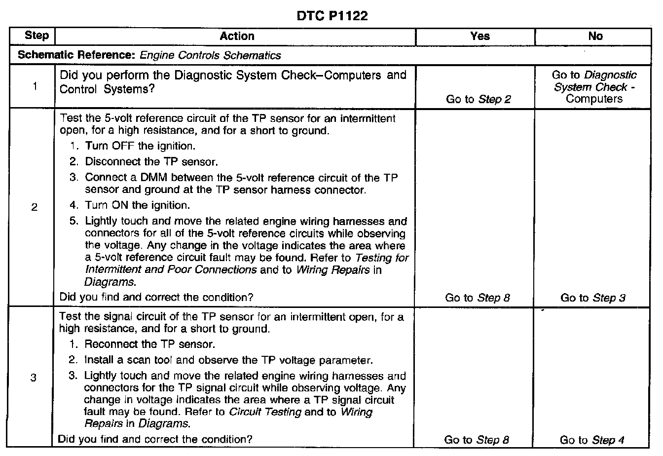 Rotation of the TP sensor rotor from the closed throttle position to the Wide Open Throttle (WOT) position provides the PCM with a signal voltage from less than 1 volt to more than 4 volts through the TP sensor signal circuit. If the PCM detects an intermittent excessively low signal voltage, this Diagnostic Trouble Code (DTC) will set.