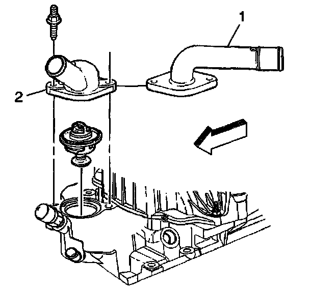 27. If reusing the Engine Coolant Temperature (ECT) sensor plug (1) or the ECT sensor (2) (if equipped), apply sealant GM P/N 12346004 or equivalent to the threads of the ECT sensor plug (1) or the ECT sensor (2).