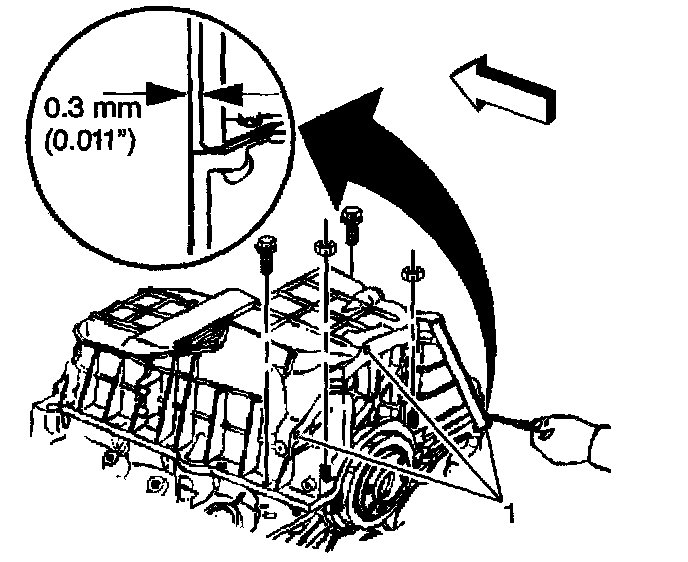 Use a feeler gauge to check the clearance between the oil pan-to-transmission housing measurement points. If the clearance exceeds 0.3 mm (0.011 inch) at any of the 3 oil pan-to-transmission housing measurement points (1), then repeat the step until the oil pan-to-transmission housing clearance is within the specification. The oil pan must always be forward of the rear face of the engine block.