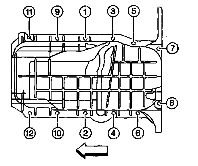 8. Tighten the oil pan bolts and nuts in sequence(L12).