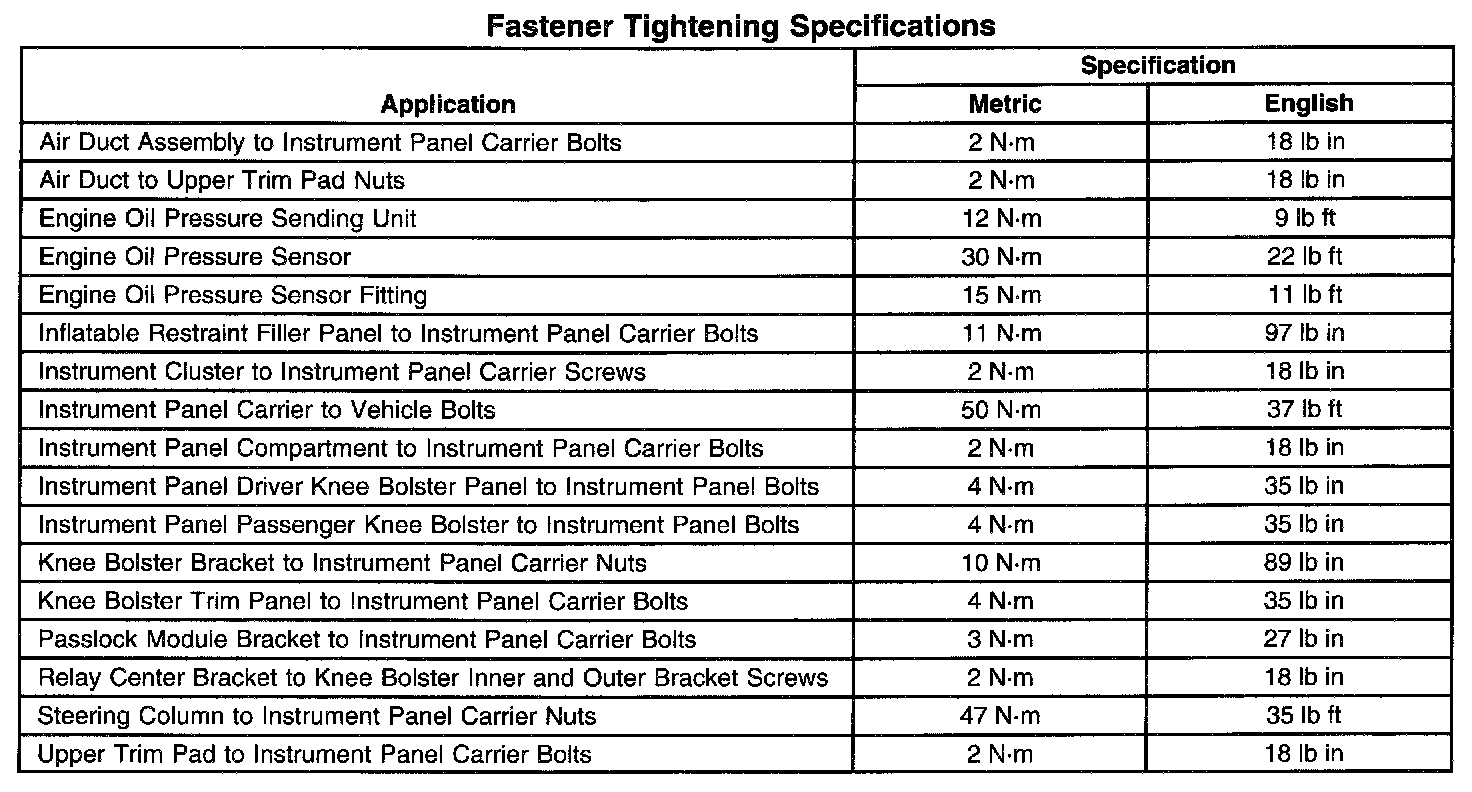 Instrument Panel, Gauges and Warning Indicators: Specifications