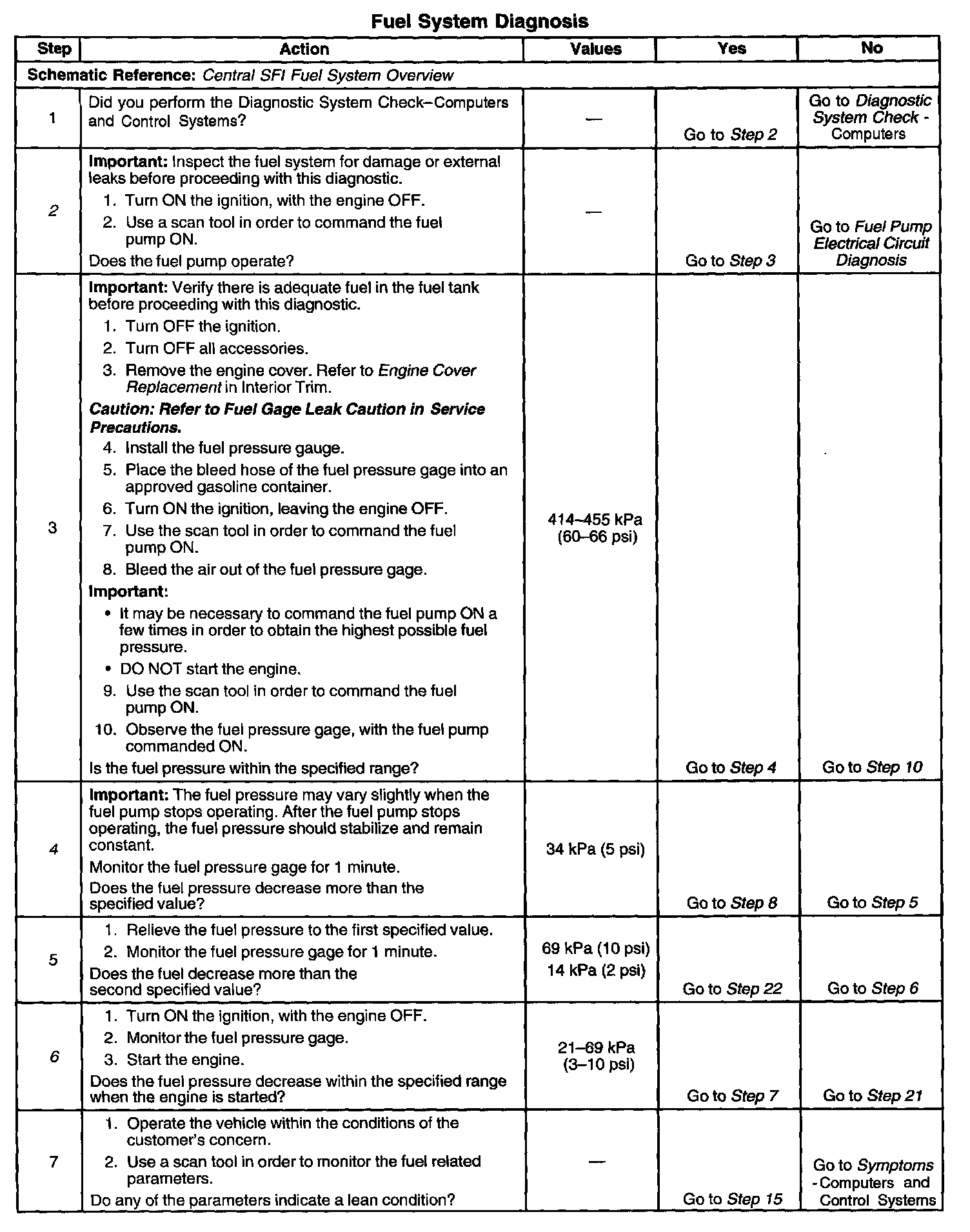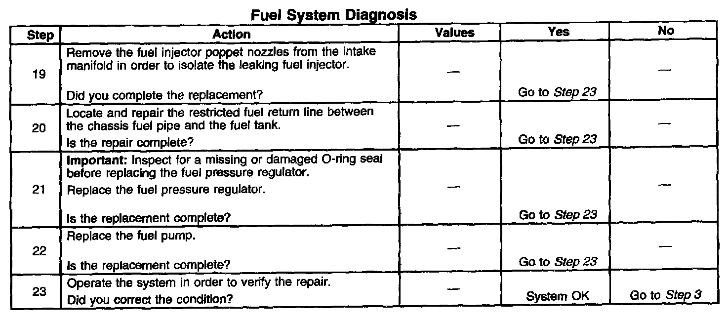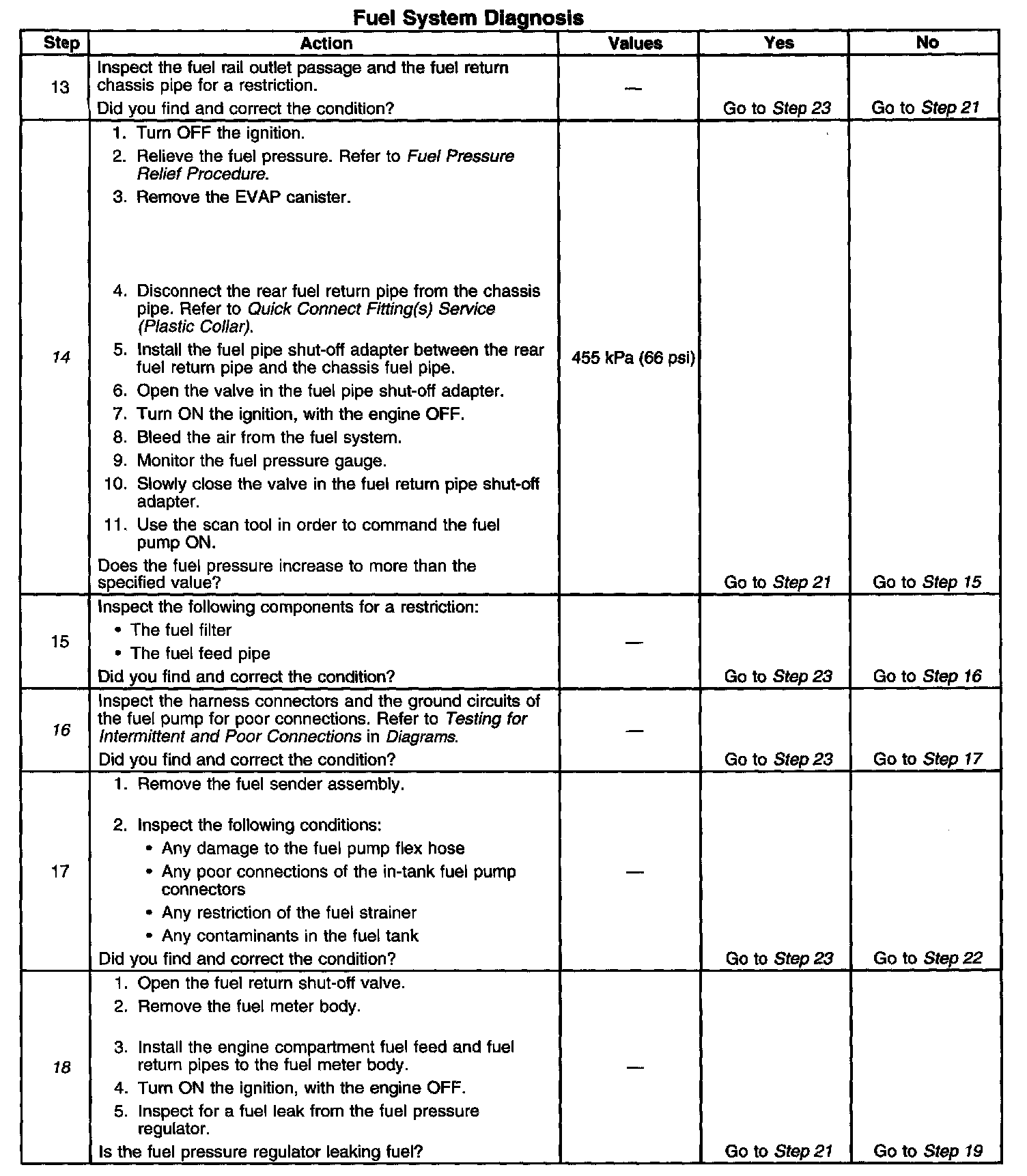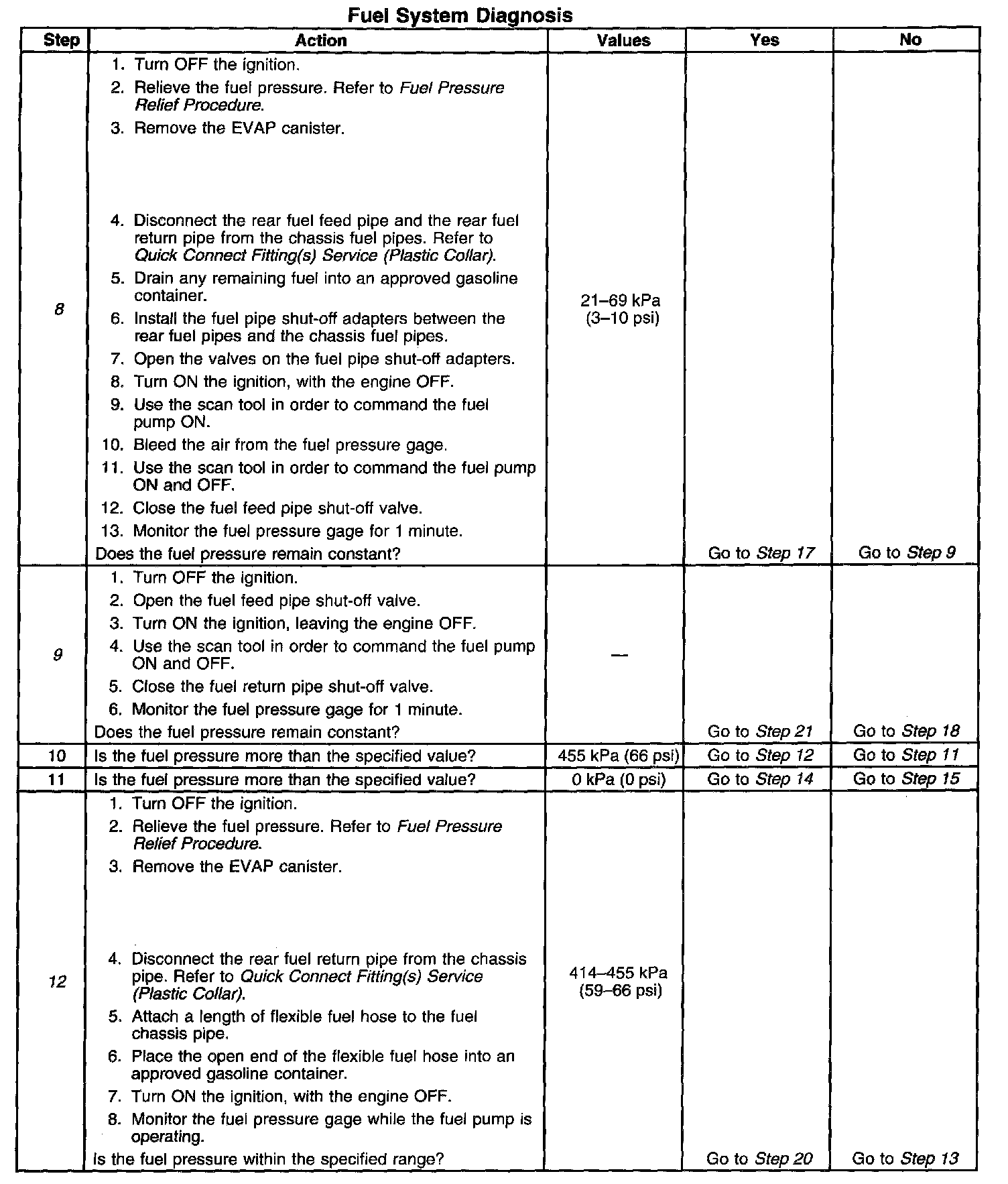 12. This step tests for a restricted fuel return pipe. If the fuel pressure is within the specified range, a restriction in the fuel return pipe is indicated.