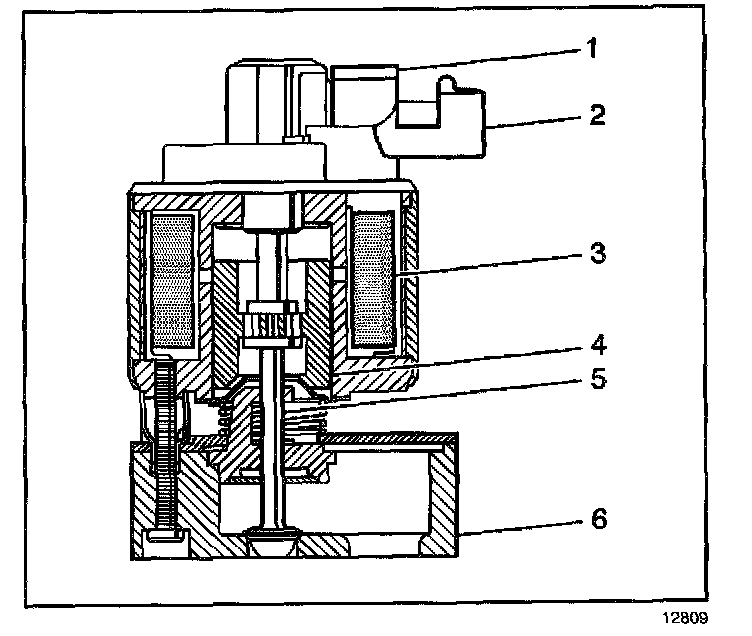 A Pulse Width Modulated (PWM) signal from the PCM enters the valve through an electrical connector which energizes the solenoid, or bobbin and coil, assembly (3). This causes the armature assembly (4), (6) to be pulled upward, lifting the pintle (5) a variable amount off the base.