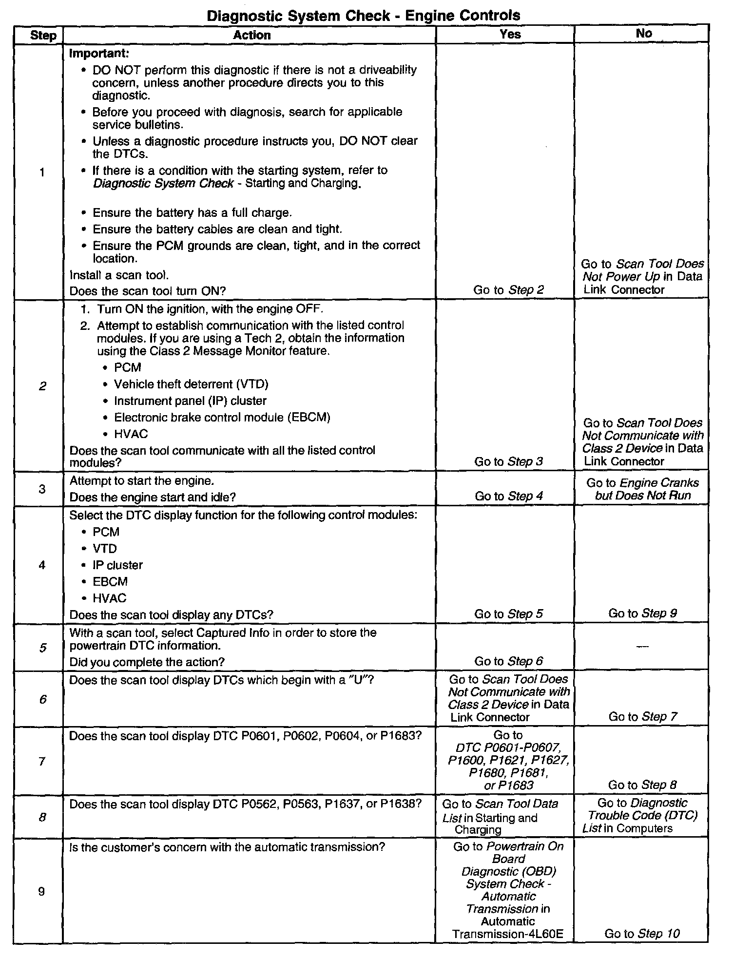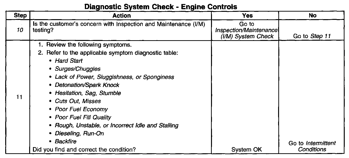 The Diagnostic System Check-Computers and Control Systems is an organized approach to identifying a condition that is created by a malfunction in the powertrain control system. The Diagnostic System Check must be the starting point for any driveability concern. The Diagnostic System Check directs the service technician to the next logical step in order to diagnose the concern. Understanding and correctly using the diagnostic table reduces diagnostic time, and prevents the replacement of good parts.