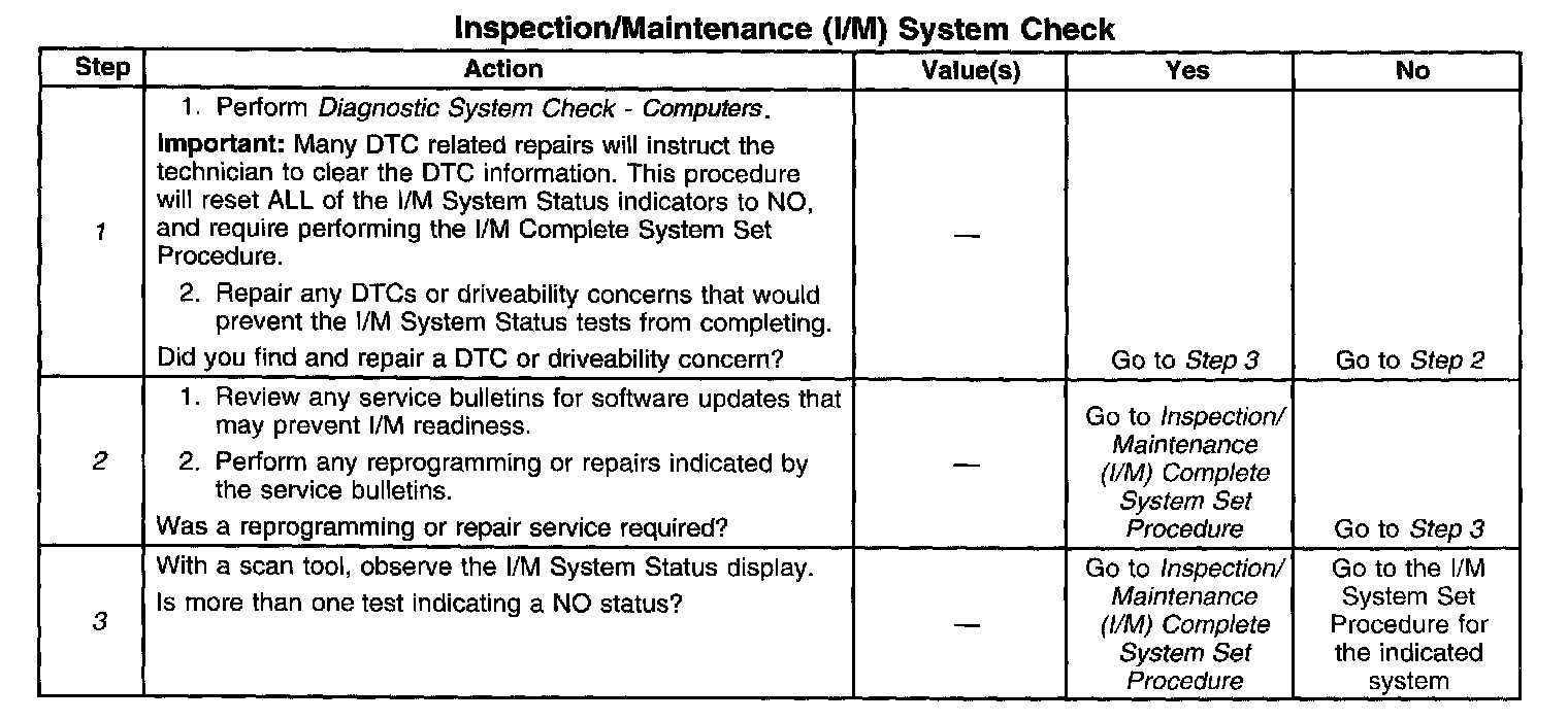 1. Any DTCs set, even those that are not listed in the Inspection/Maintenance System DTC Table, may prevent the required DTCs from running. If there is any question as to whether a set DTC is disabling the required I/M diagnostic, review the Conditions for Running in the diagnostic procedures for the DTC required by the I/M diagnostic. A list of disabling DTCs, if applicable, is contained in the supporting text for that DTC.