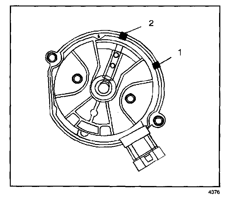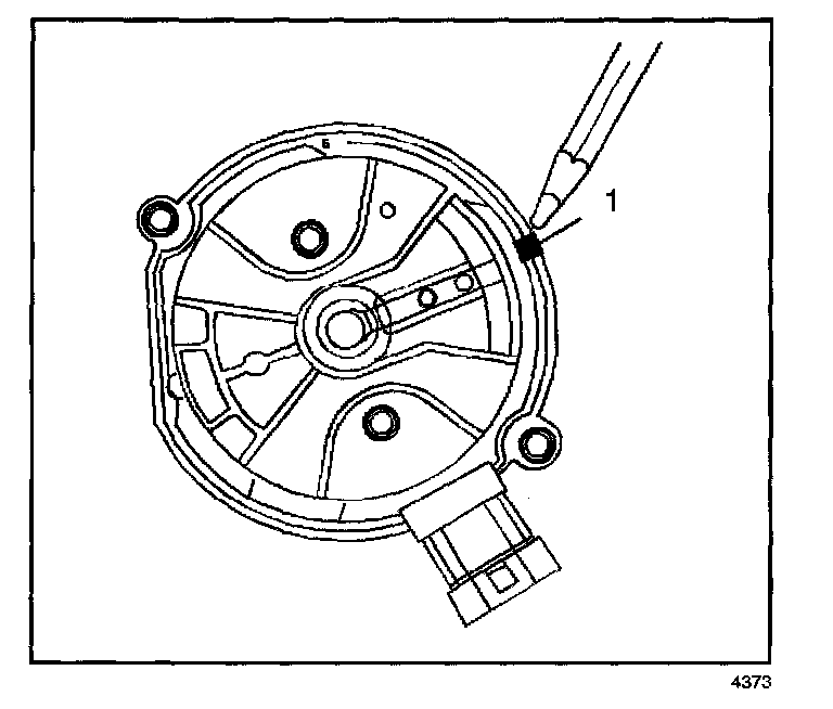 10. Use a grease pencil in order to mark the position of the rotor in relation to the distributor housing (1).