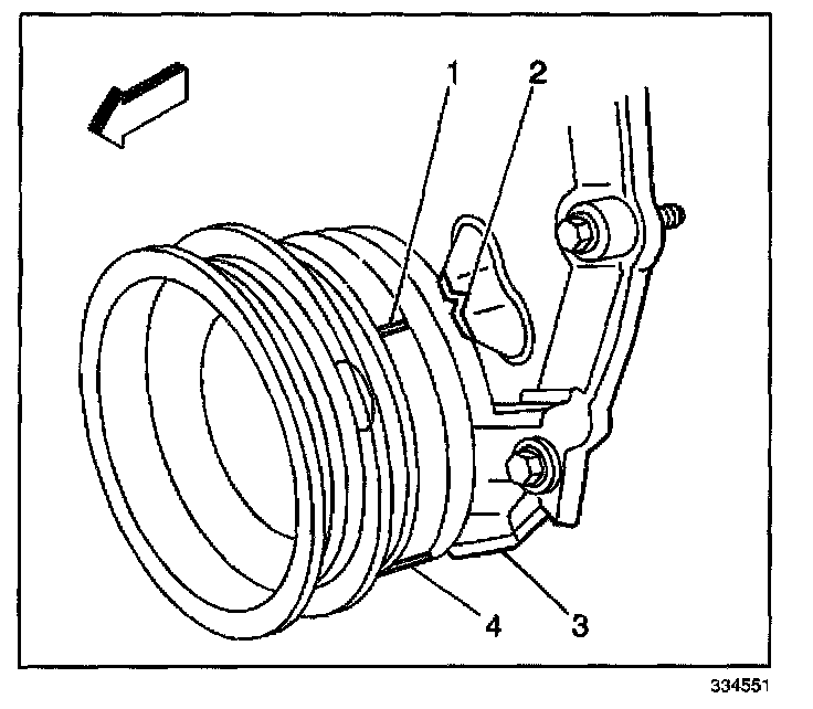 IMPORTANT: Rotate the number 1 cylinder to top dead center (TDC) of the compression stroke. The engine front cover has 2 alignment tabs and the crankshaft balancer has 2 alignment marks spaced 90 degrees apart which are used for positioning the number 1 piston at TDC. With the piston on the compression stroke and at TDC, the crankshaft balancer alignment mark (1) must align with the engine front cover tab (2) and the crankshaft balancer alignment mark (4) must align with the engine front cover tab (3).