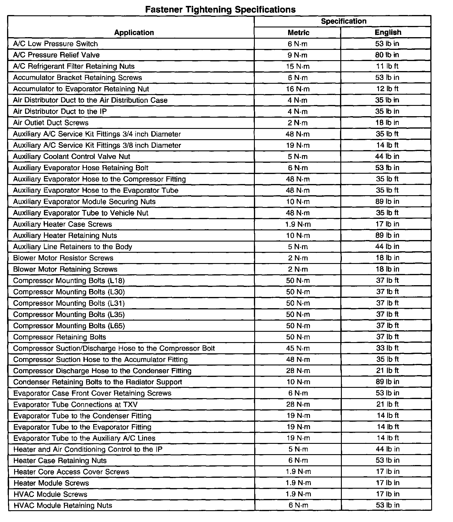 Fastener Tightening Specifications: