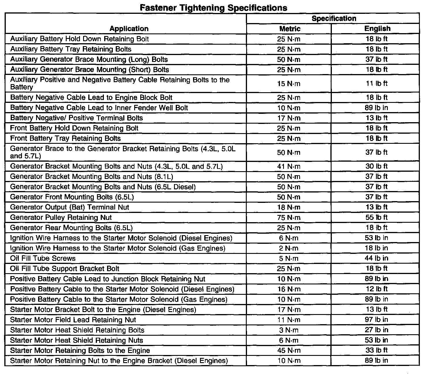 Fastener Tightening Specifications: