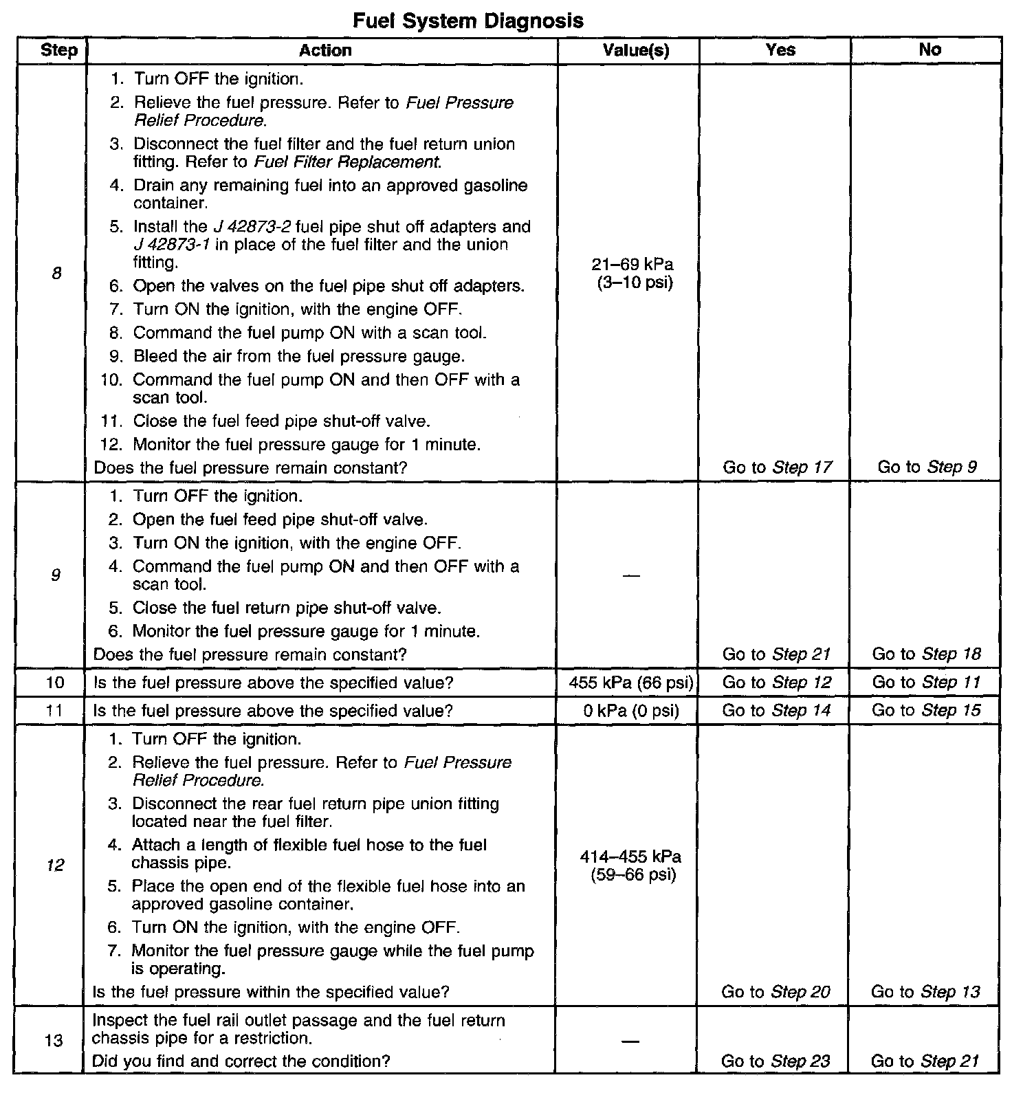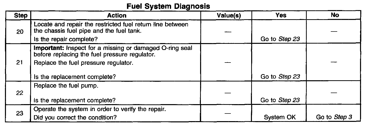 12. This step tests for a restricted fuel return pipe. If the fuel pressure is within the specified values, a restriction in the fuel return pipe is indicated.