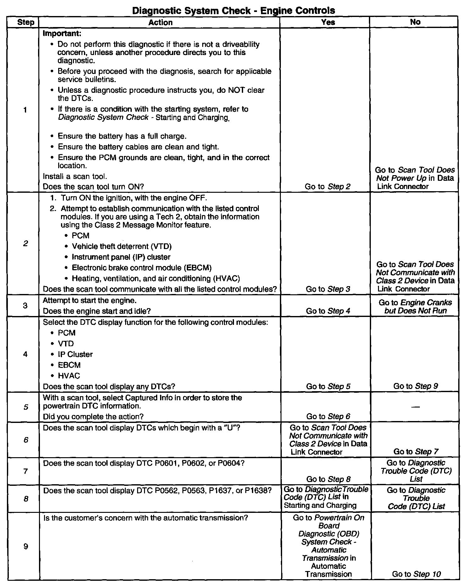 The Diagnostic System Check-Computers and Control Systems is an organized approach to identifying a condition that is created by a malfunction in the powertrain control system. The Diagnostic System Check must be the starting point for any driveability concern. The Diagnostic System Check directs the service technician to the next logical step in order to diagnose the concern. Understanding and correctly using the diagnostic table reduces diagnostic time, and prevents the replacement of good parts.