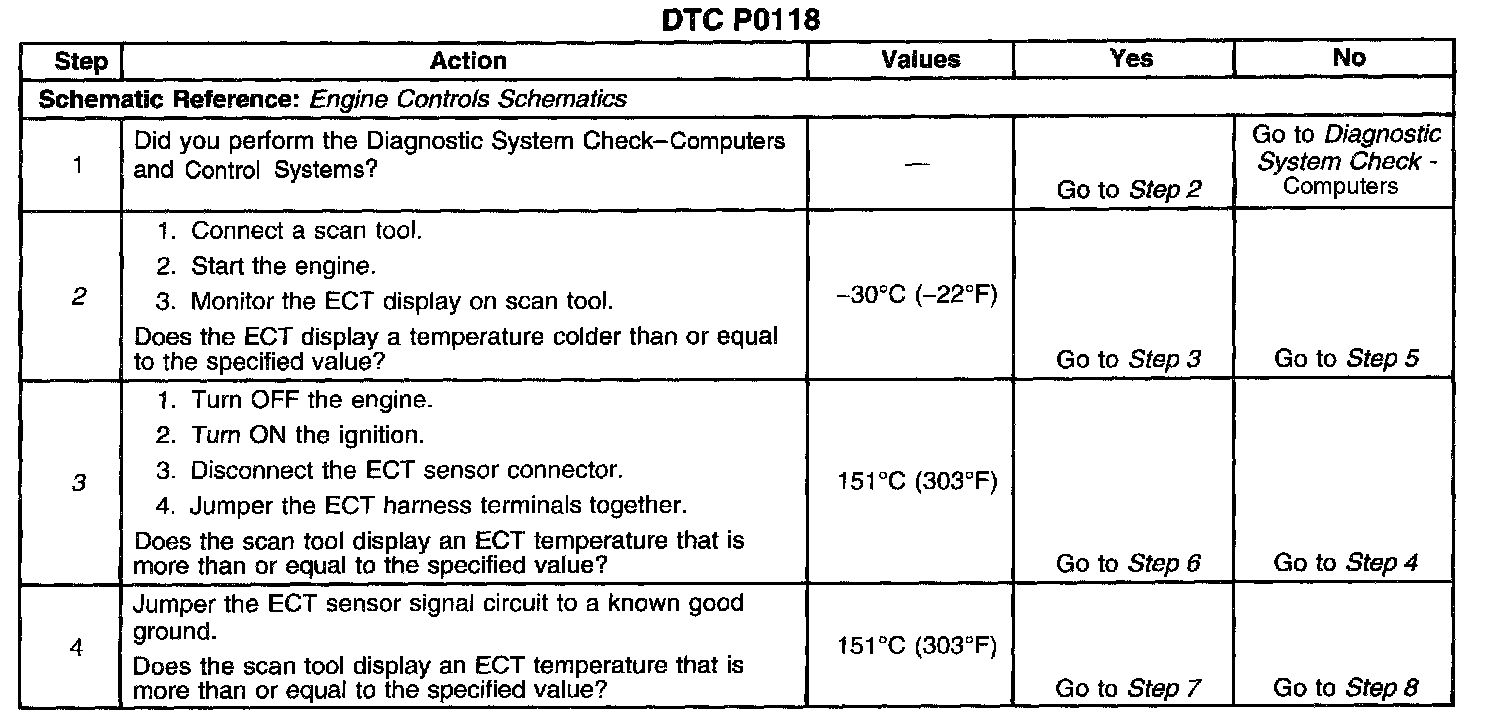 9. This step determines if there is a short to voltage on the signal circuit. A short to voltage increases the current flow through the sensor, which overwhelms the sensor. This does not allow the sensor to pull down the circuit to the correct voltage and thus display the correct temperature.