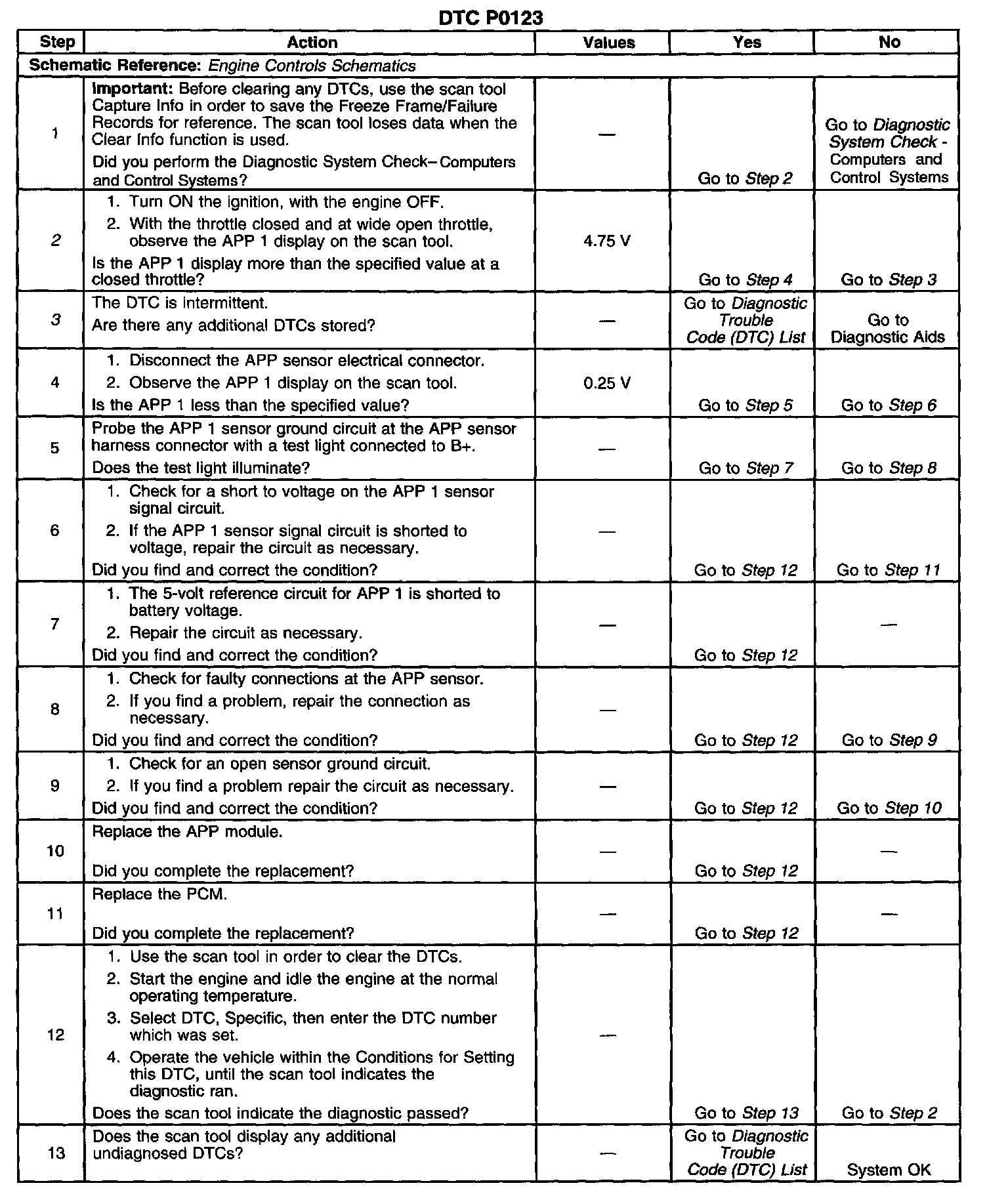 A scan tool reads the APP 1 position in volts. The APP 1 position should read approximately 0.45-0.95 volts with the throttle closed and the ignition ON or at idle. The voltage should increase at a steady rate as the throttle is moved toward Wide Open Throttle (WOT). Also, 90 percent pedal travel is acceptable for correct APP operation. Scan the APP 1 sensor while depressing the accelerator pedal with the engine stopped and the ignition ON. The display should vary from approximately 0.74 volts when the throttle is closed to approximately 3.7 volts when the throttle is held at the WOT position. A DTC P0123 will result if the ground circuit is open or if the signal circuit is shorted to voltage.