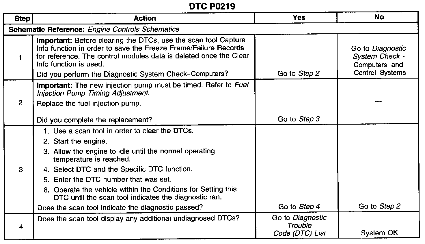 This DTC will not set if an external fuel source is causing an overspeed condition. DTC P1216 will set along with DTC P0219.