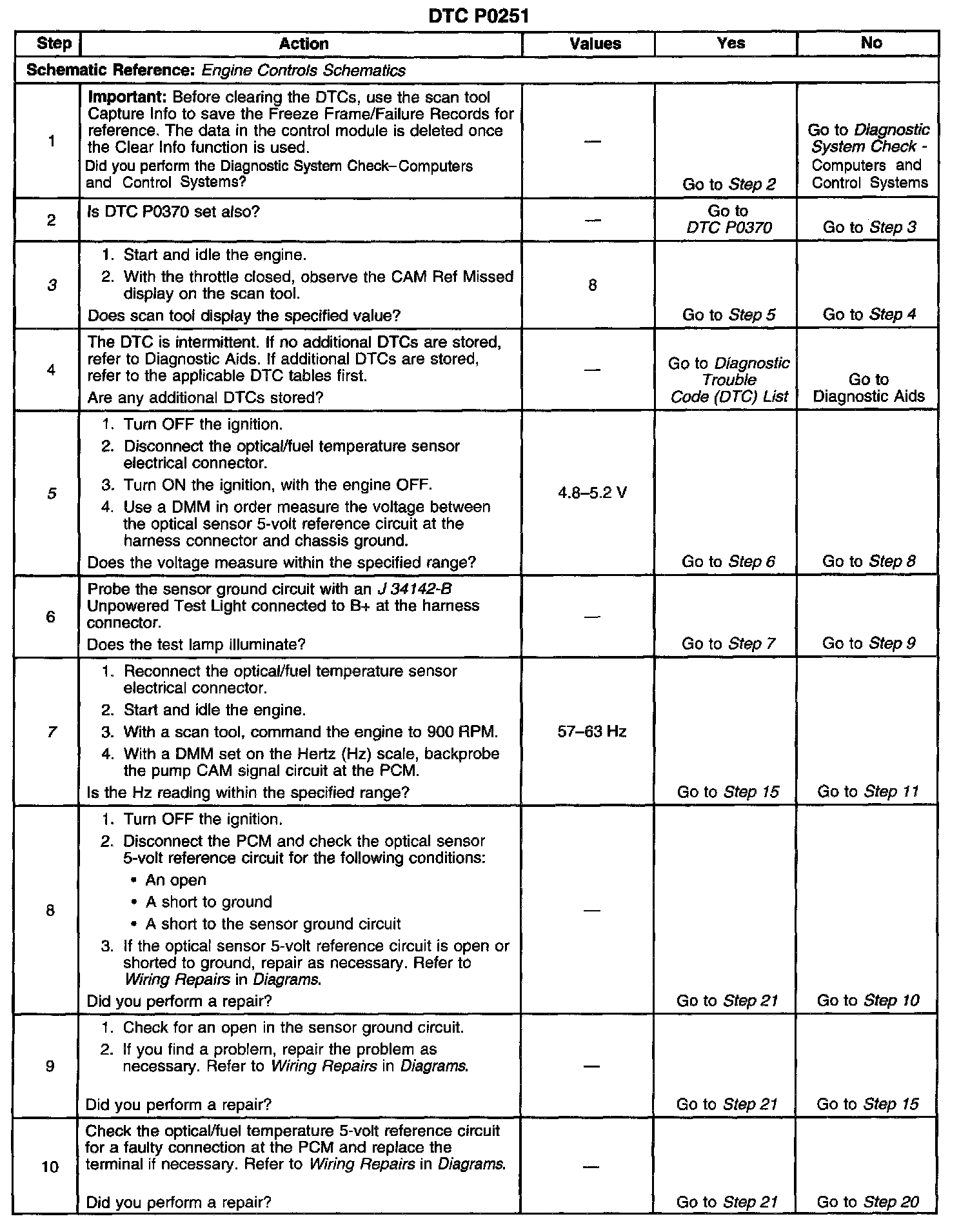 CIRCUIT DESCRIPTIONThe optical sensor provides a pump cam signal to the Powertrain Control Module (PCM) by counting the pulses from the sensor that monitors slots on the data track disk that is located inside the injection pump. The pump cam is one of the most important PCM inputs for fuel control and timing. This test monitors the number of crankshaft position pulses that have occurred since the last cam pulse. The physical one-to-one correspondence between the pump cam and the crankshaft implies that if more crank pulses than cam pulses are detected, the cam pulses have been missed.