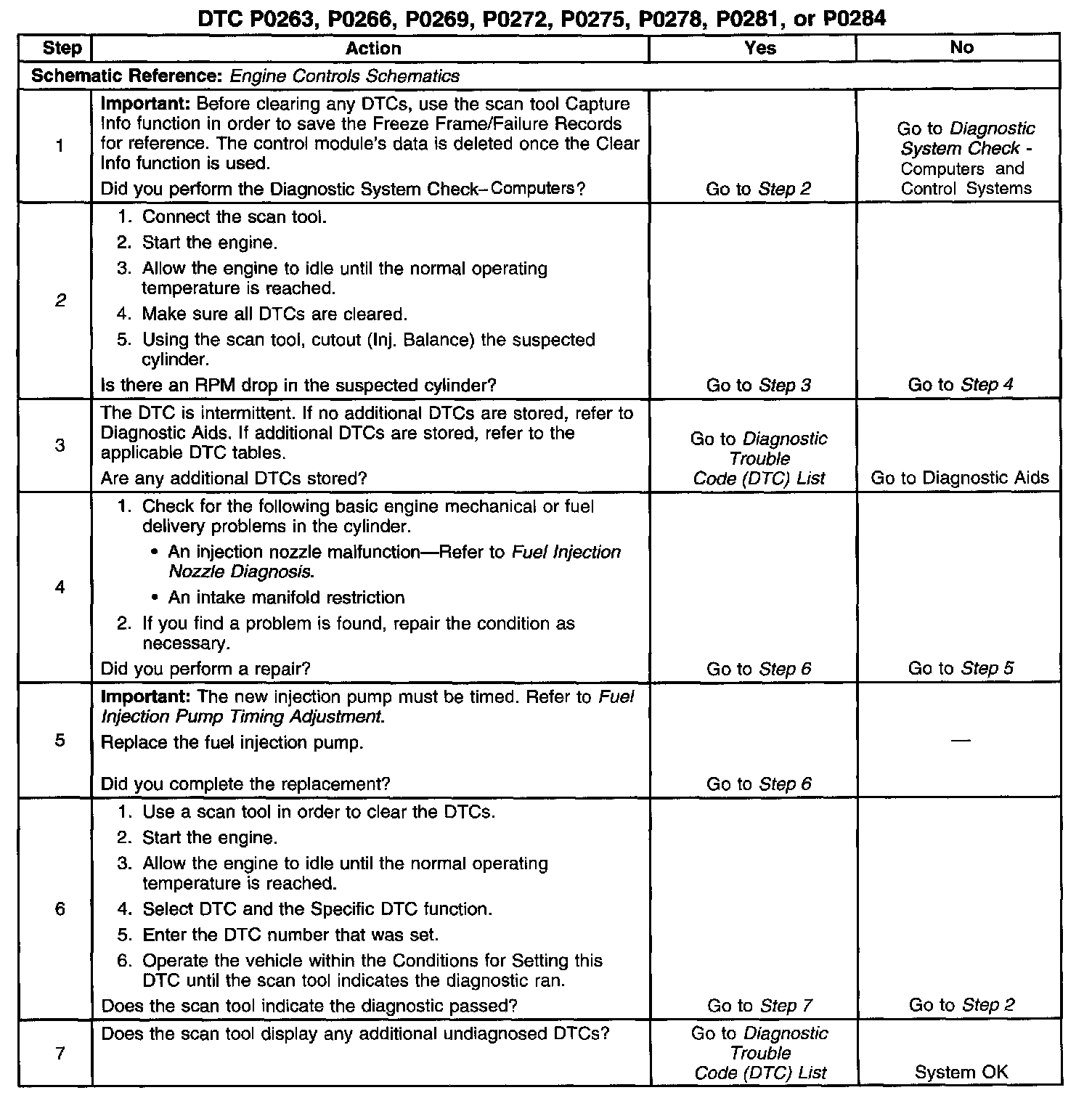 The injector balance test on the scan tool should be used to confirm fault cylinder problems. The scan tool will cutout the specific cylinder requested. If a cylinder balance fault has been detected and the engine has been running for a long time, the PCM may try to increase or decrease fuel in the other cylinders in order to compensate for a rough idle. This can cause multiple cylinder balance DTCs to set. Malfunctioning nozzles are the most likely cause of cylinder balance DTCs.