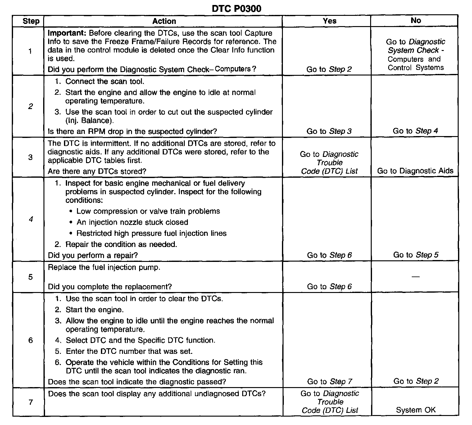 The numbers below refer to the step numbers on the diagnostic table.