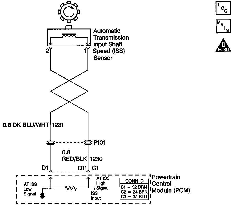 The Automatic Transmission Input Shaft Speed (AT ISS) sensor provides transmission input speed to the Powertrain Control Module (PCM). The AT ISS sensor is a Permanent Magnet (PM) generator. The sensor mounts into the transmission case and maintains a slight air gap between the sensor and the forward clutch housing. The PM generator produces an AC voltage as the forward clutch housing rotor teeth pass through the sensor's magnetic field. The AC voltage level increases as the turbine shaft speed increases. The PCM converts the AC voltage into a digital signal. The PCM determines actual turbine speed using the digital signal. The PCM uses the input speed to calculate torque converter slip speed, and gear ratios.