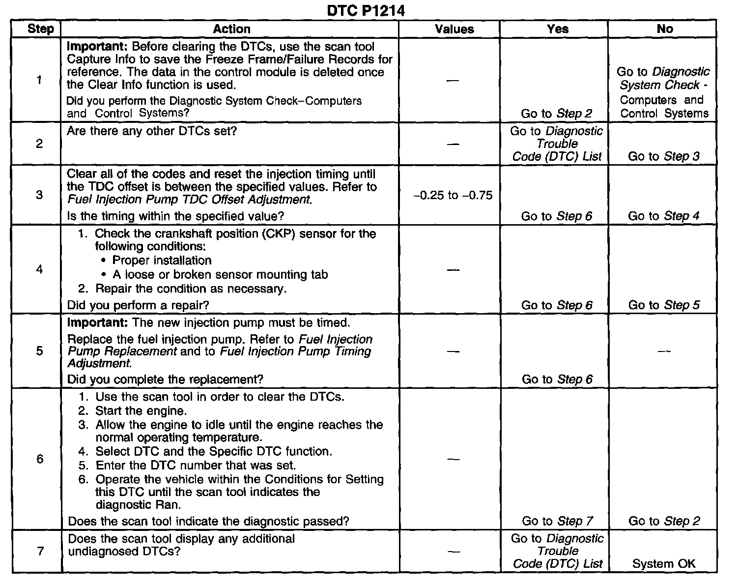 The PCM will only run the diagnostic test if the TDC offset adjustment time set procedure has been activated. The vehicle will most likely not be brought in with this DTC set. Refer to Fuel Injection Pump TDC Offset Adjustment.