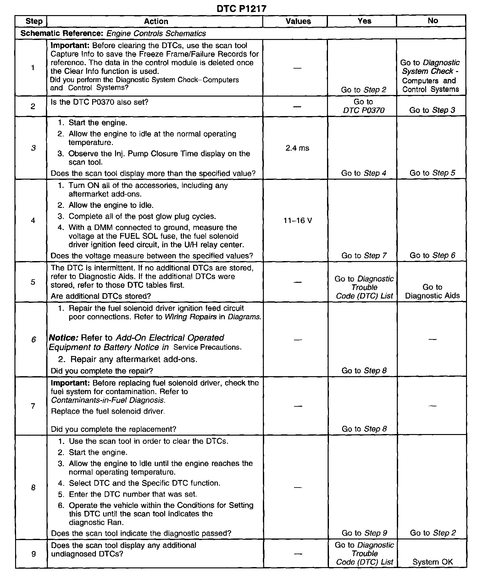 A weak (mechanical failure) fuel solenoid will result in a DTC P1217. If DTC P1217 is set with any other DTCs, diagnose them first. If the vehicle is running close to the DTC setting closure time, the vehicle should be checked during cold start ups and during hot conditions.