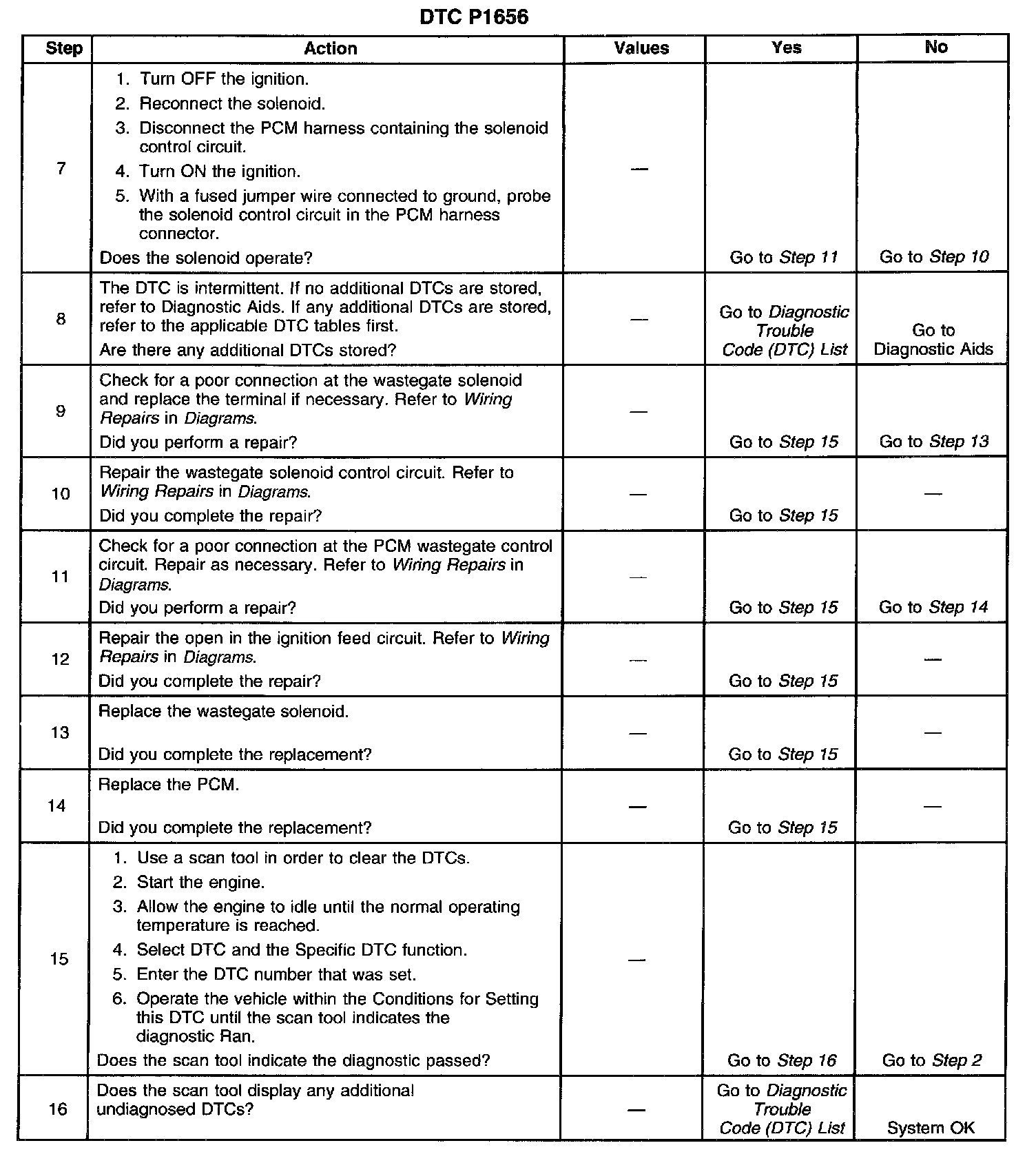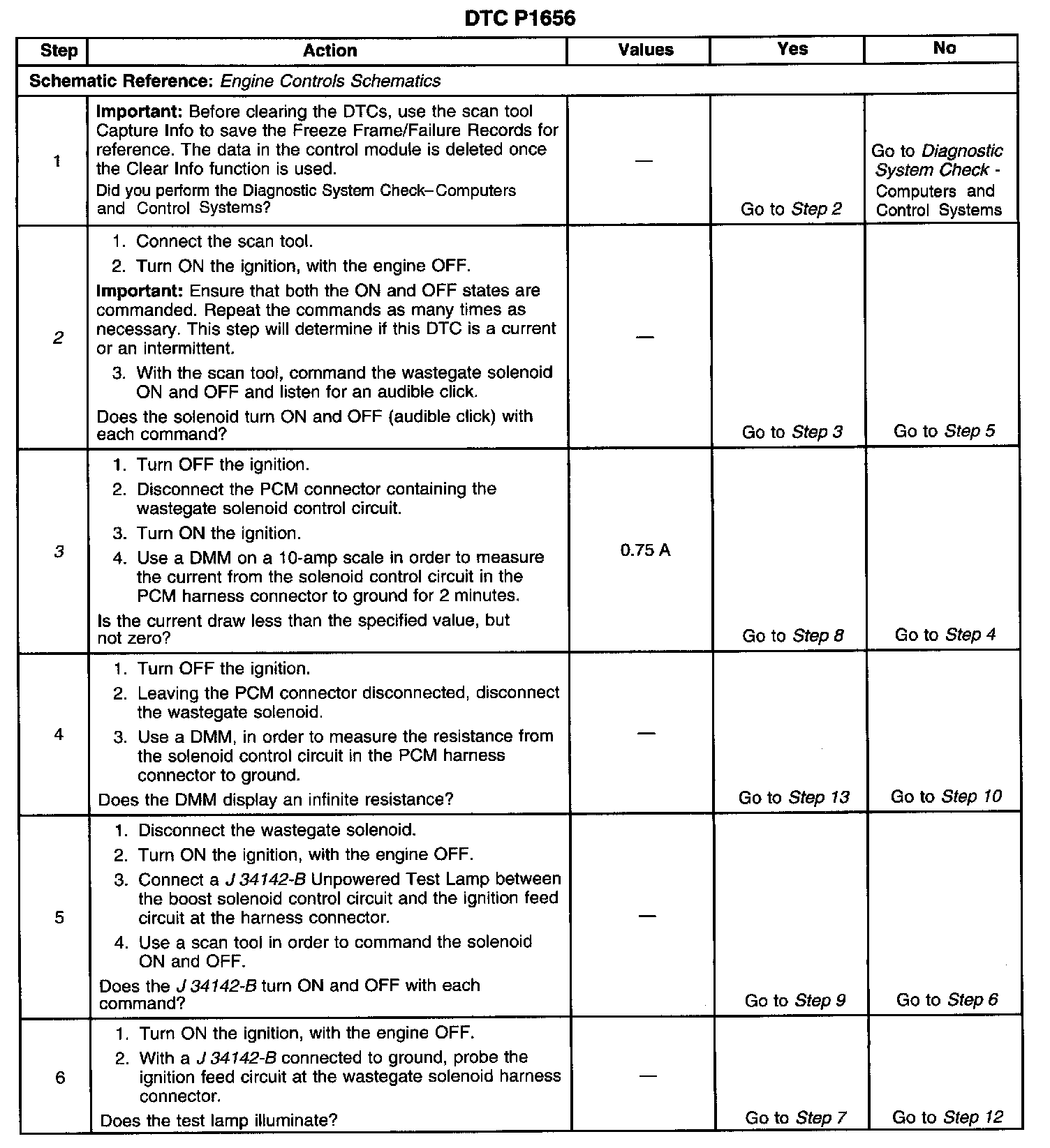 This diagnostic will set when the control circuit does not follow the PCM command. When the solenoid is requested ON, the voltage will drop. When the solenoid is OFF, the ignition voltage will be present. The scan tool has a 5 second ON time abort. The wastegate solenoid can be commanded ON for as many times as needed, in 5 second intervals. DTC P0236 may possibly set along with DTC P1656. This diagnostic can be checked during key up. The engine will not respond to the scan tool commands at the idle. The engine is unable to achieve the boost pressures that are more than Barometric Pressure (BARO) at idle. The engine will also not respond to the scan tool commands at any engine speed which is more than the idle. The PCM control abort in order to prevent the engine damage.