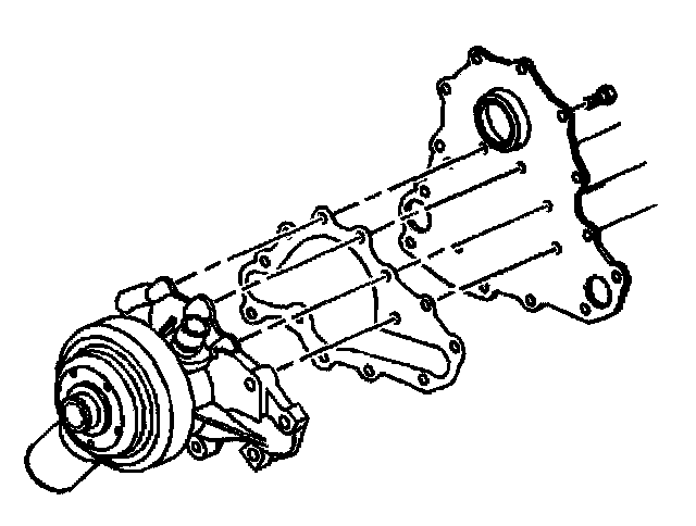 ^ Tighten the water pump to the front cover bolts to 42 Nm (32 ft. lbs.).