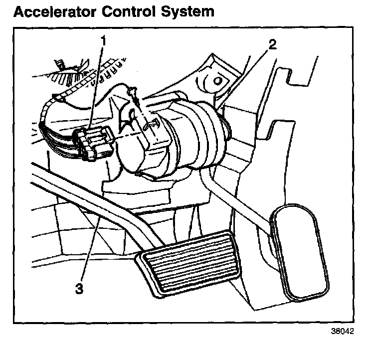 The accelerator control system consists of an electronically controlled throttle type with an accelerator pedal attached to an accelerator pedal position module (2). This module sends the signals to the PCM that control the fuel injection pump.