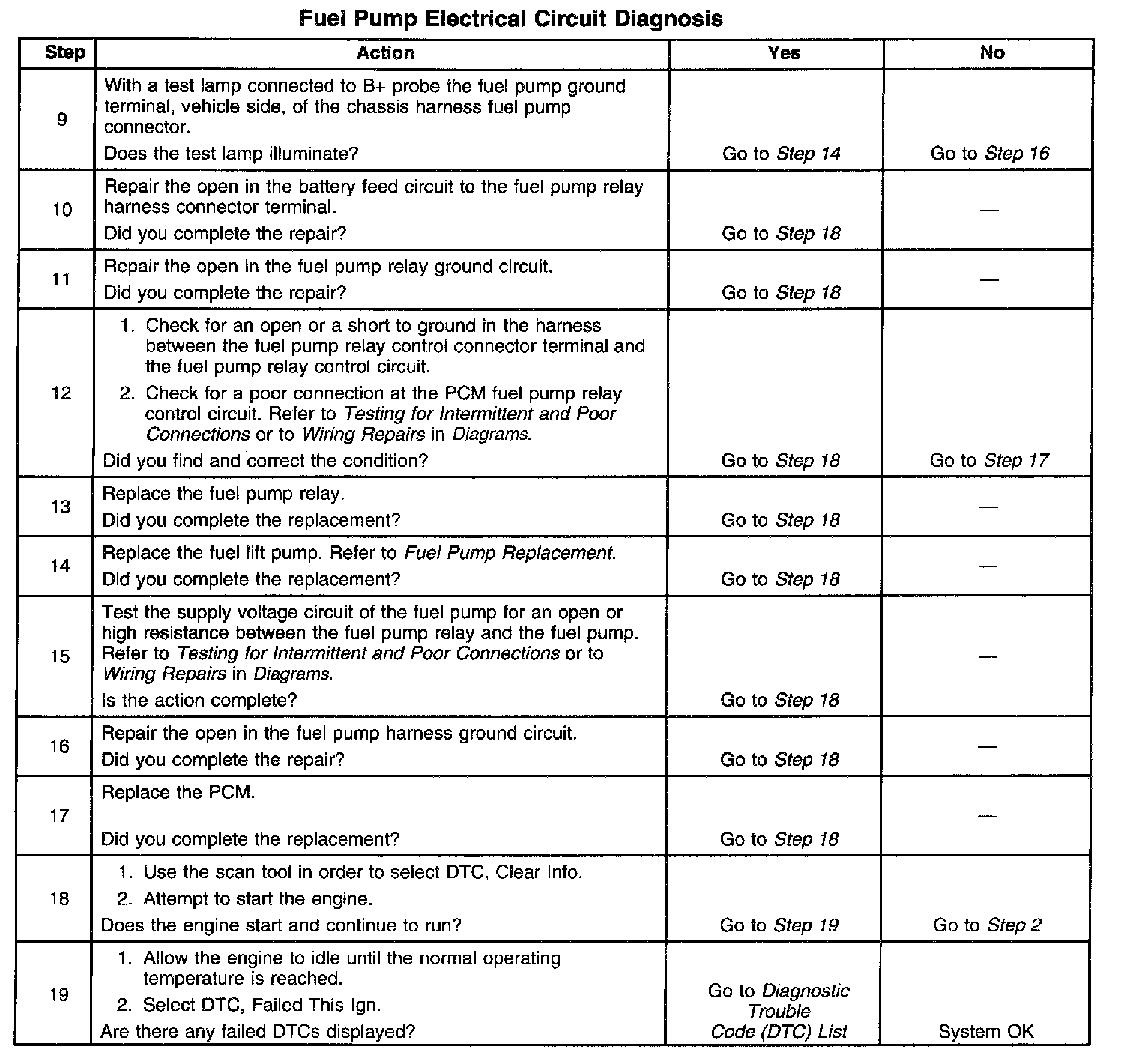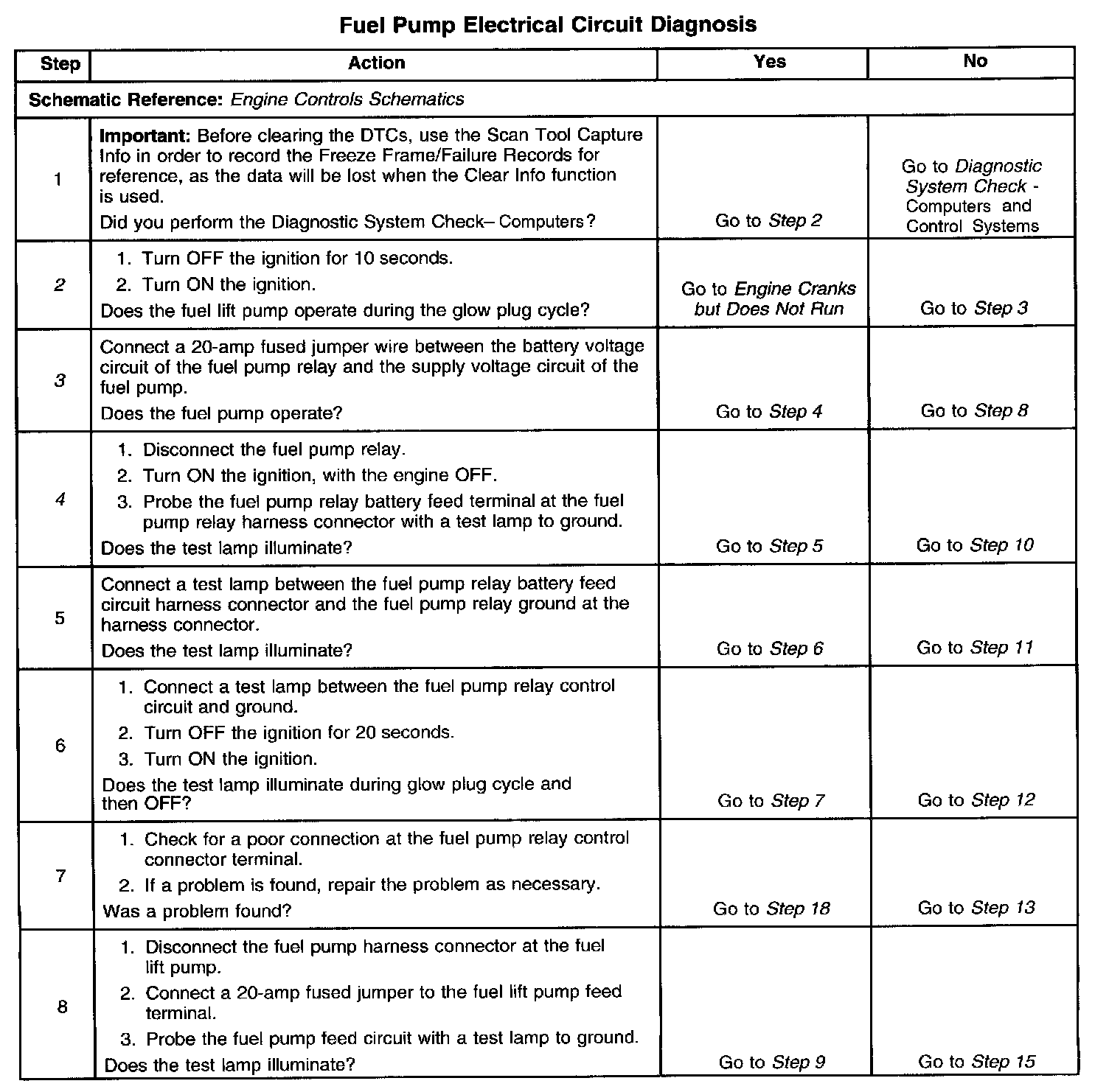 CIRCUIT DESCRIPTIONWhen the key is turned ON, the Powertrain Control Module (PCM) energizes the fuel pump relay which sends voltage to the lift pump. The lift pump remains ON during the glow plug cycle. If the engine is not started immediately after the glow plug cycle, the PCM shuts the fuel lift pump OFF and waits for the crank reference signal.