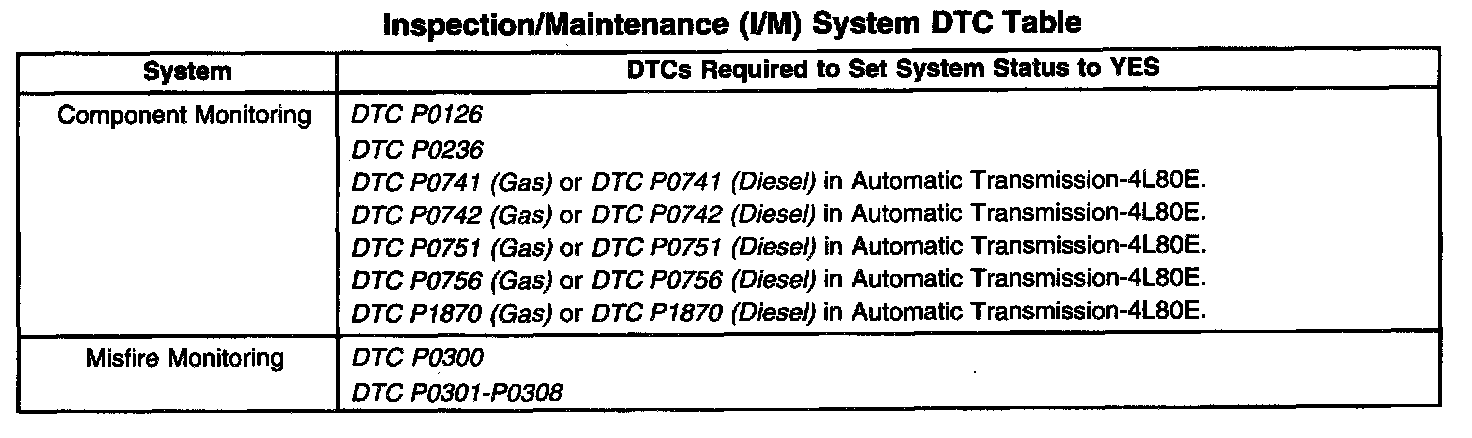 Inspection/Maintenance (I/M) System DTC Table: