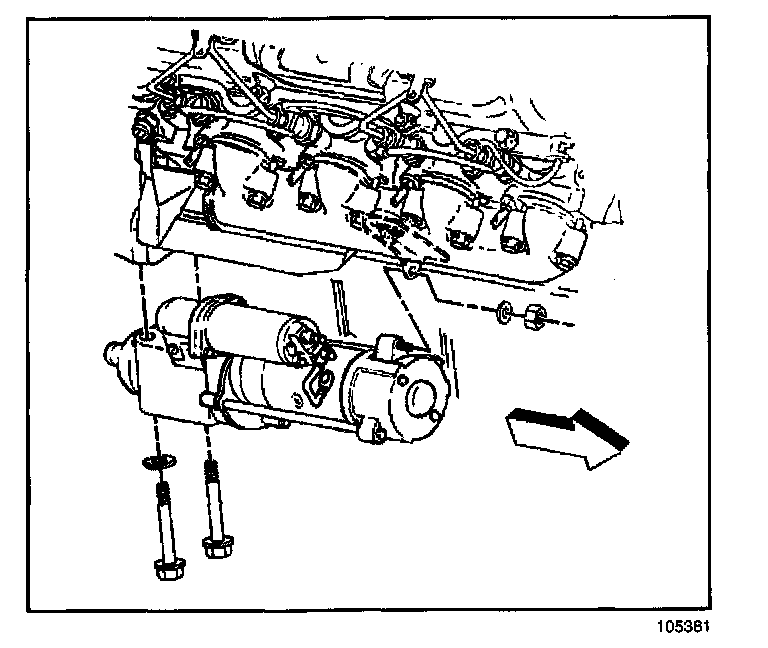 4. Install the starter motor bolts to the engine.