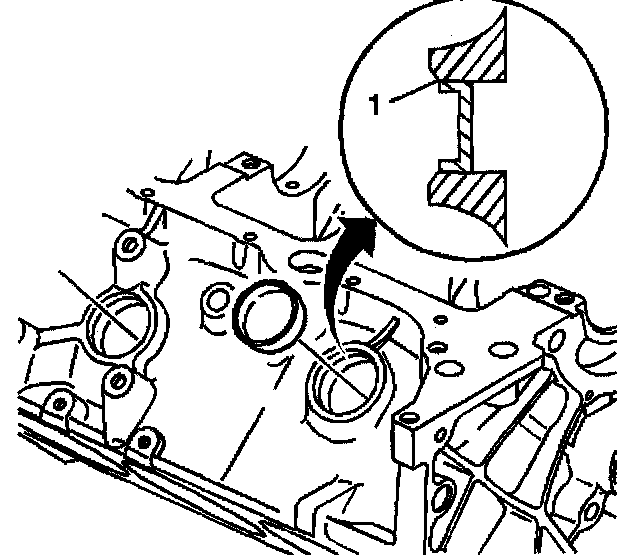5. Install the NEW engine block core hole plugs. A properly installed engine block core hole plug must be installed flush with the bottom of the chamfer (1) of the engine block core hole.