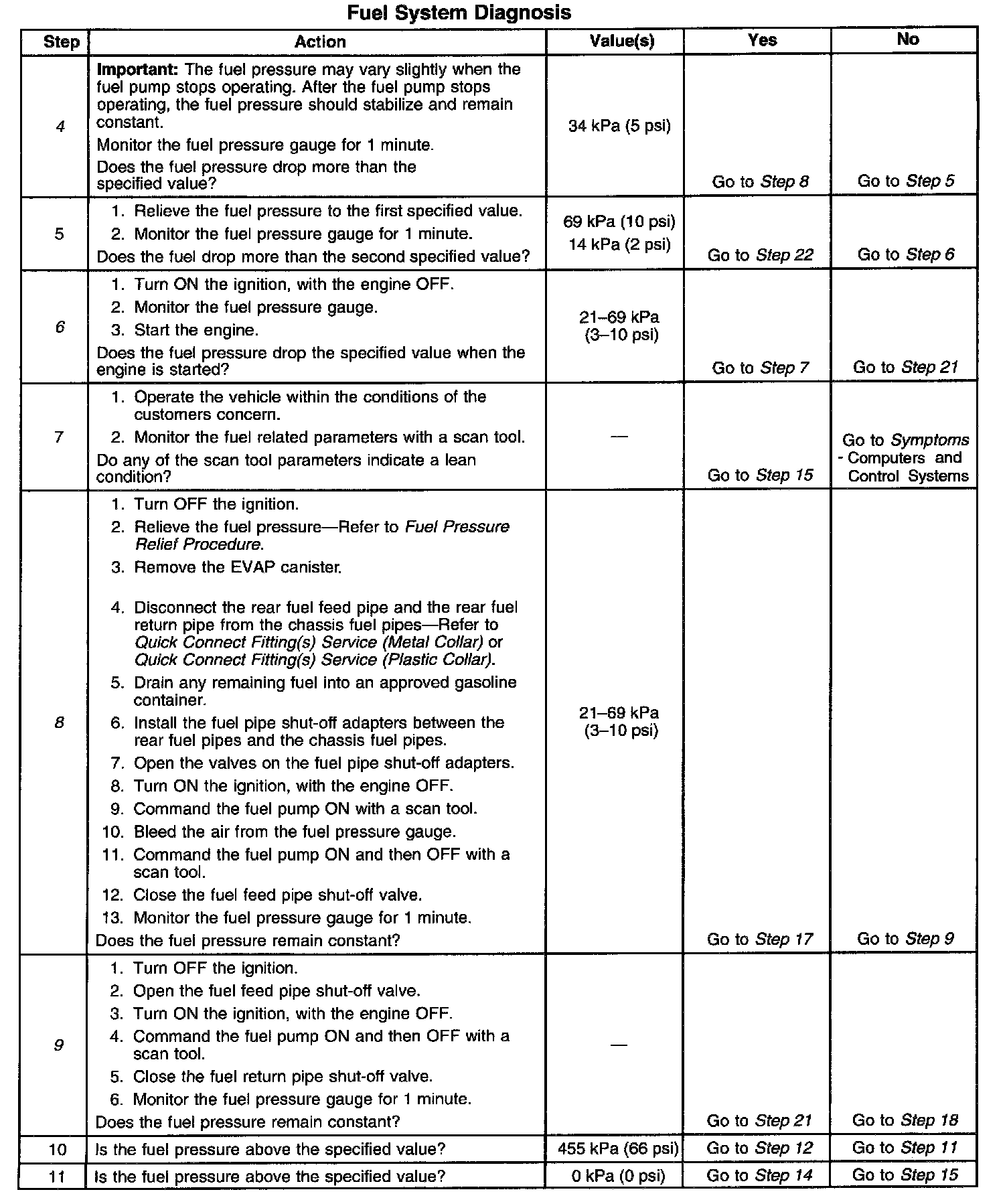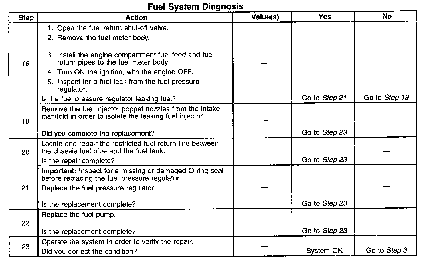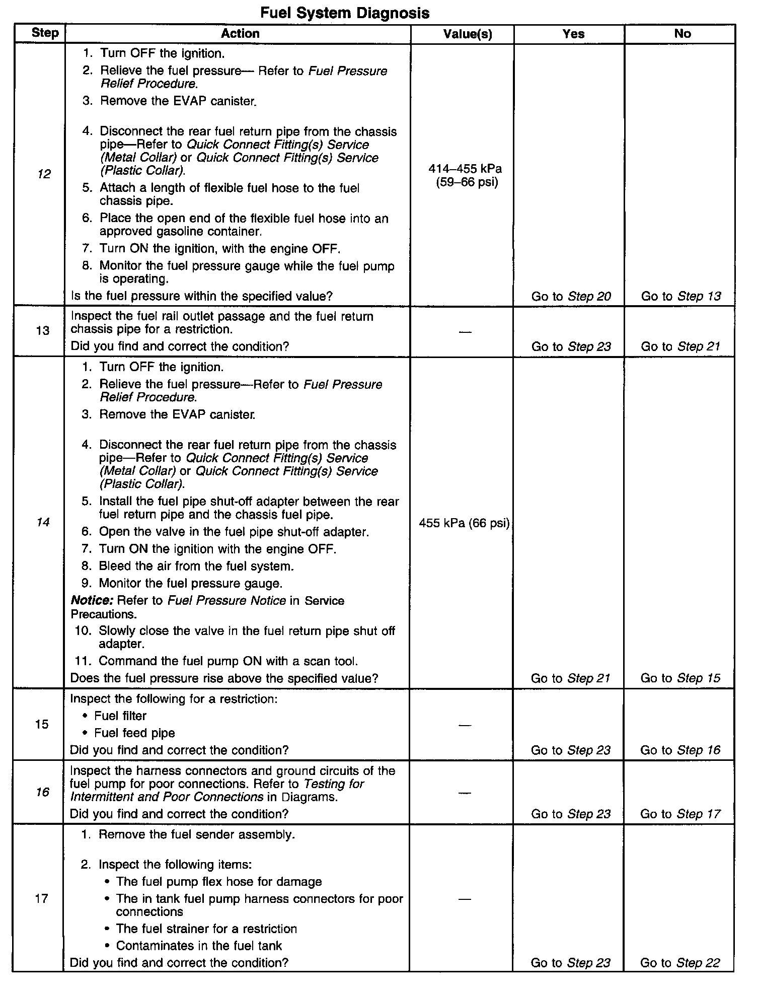 12. This step tests for a restricted fuel return pipe. If the fuel pressure is within the specified values, a restriction in the fuel return pipe is indicated.