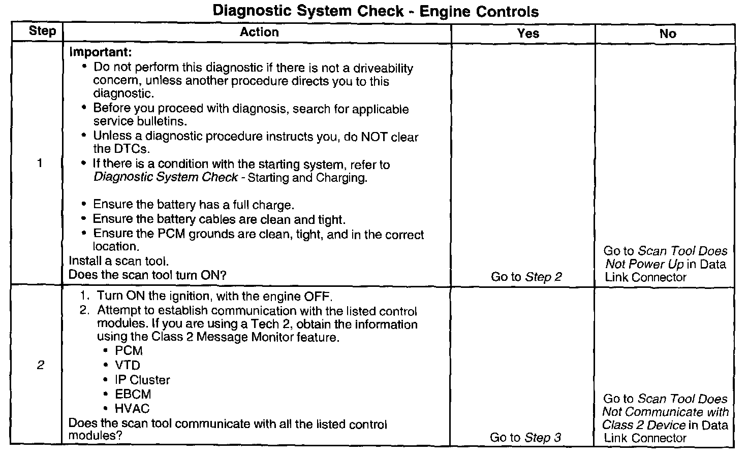 2. Lack of communication may be because of a partial or a total malfunction of the Class 2 serial data circuit. The specified procedure determines the particular condition.
