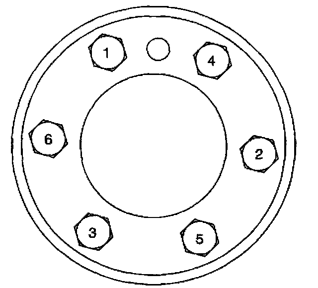 Tighten the engine flywheel bolts in sequence (1 - 6) to