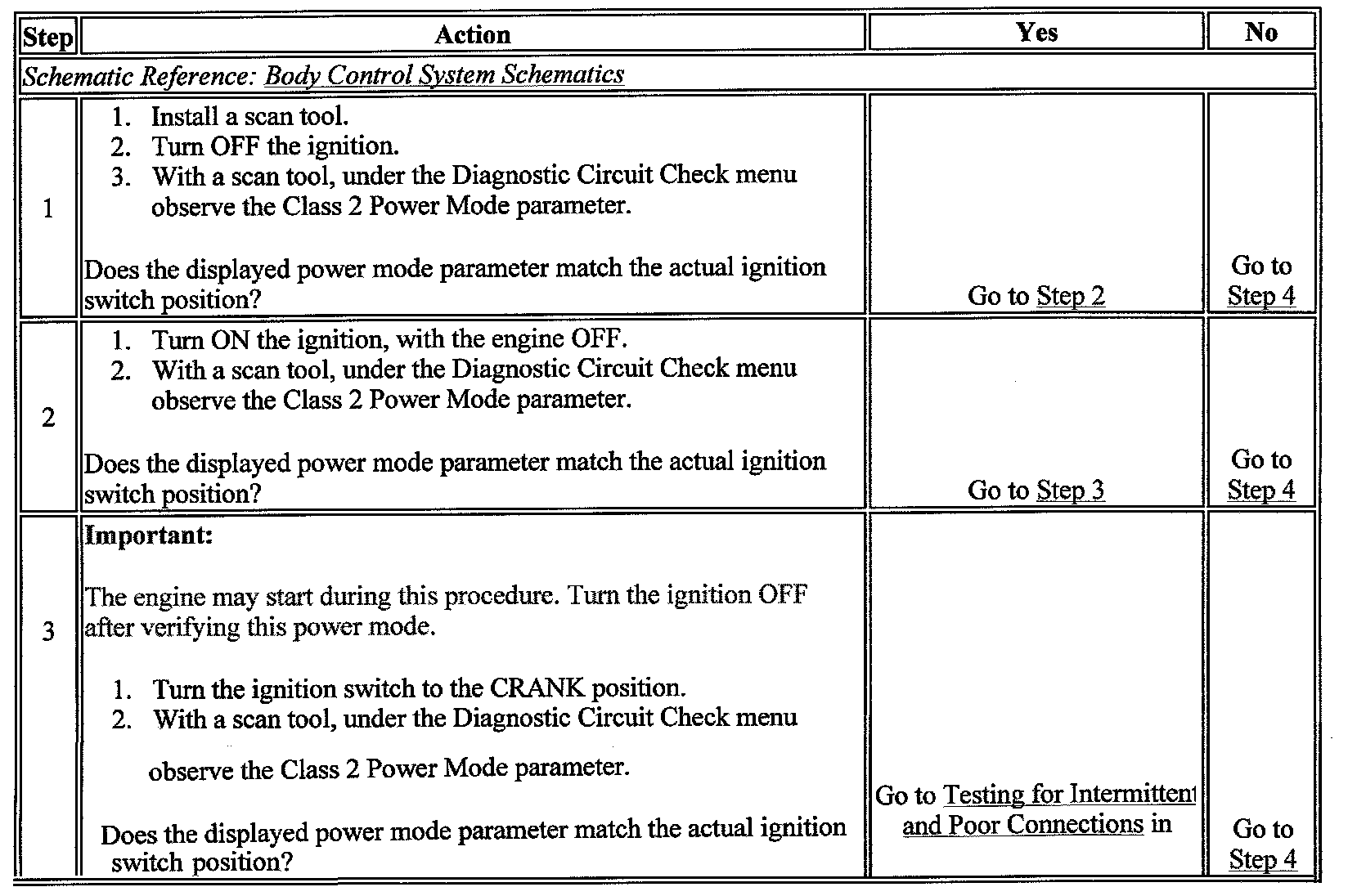 Normal vehicle class 2 communications and module operations will not begin until the system power mode has been identified. Discrete wires from the ignition switch contacts are monitored by the power mode master (PMM) module in order to determine the correct power mode. The PMM communicates the system power mode to all class 2 modules on the class 2 serial data line. Refer to Body Control System Description and Operation to identify which module is the PMM and the applicable power mode look up table.