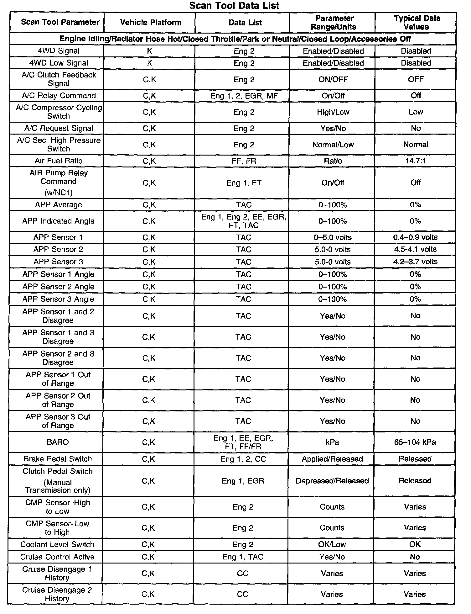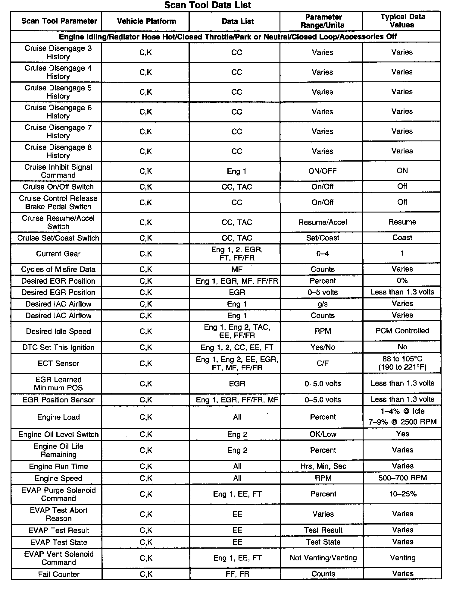 The Engine Scan Tool Data List contains all engine related parameters that are available on the scan tool. The list is arranged in alphabetical order. A given parameter may appear in any one of the data lists, and in some cases may appear more than once, or in more than one data list in order to group certain related parameters together.