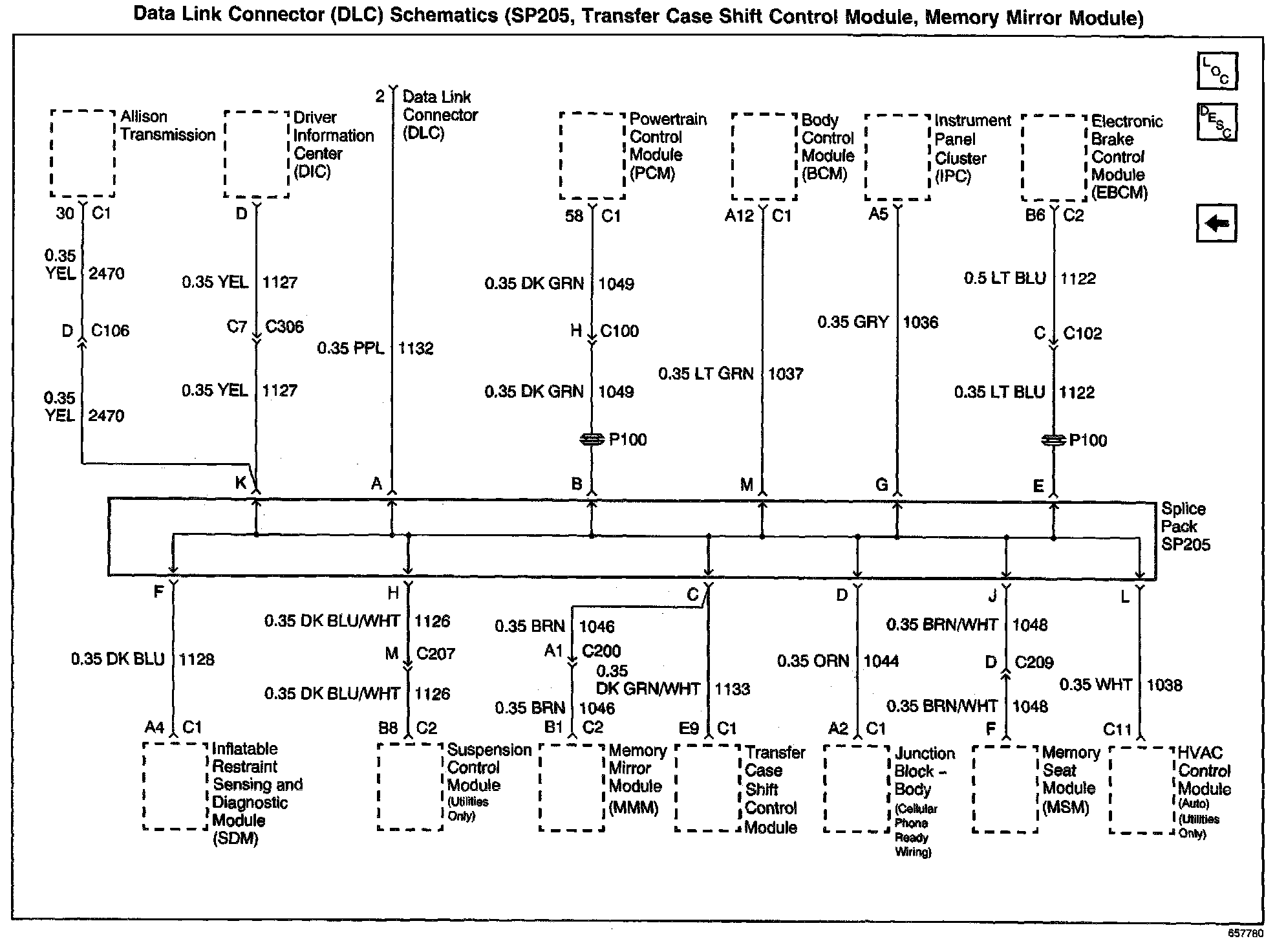 Data Link Connector (DLC) Schematics: SP205, Transfer Case Shift Control Module, Memory Mirror Module: