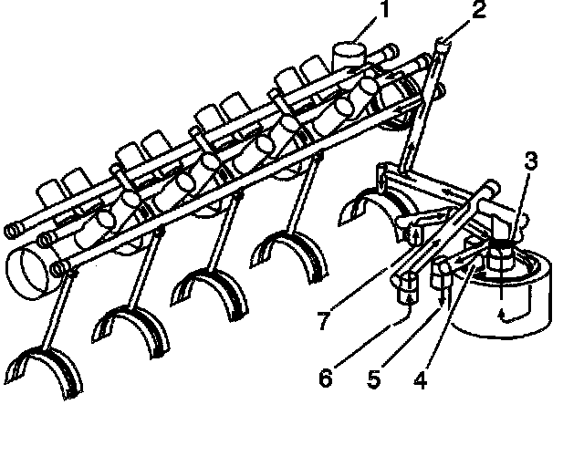 Lubrication DescriptionThe gear-type oil pump is driven through an extension driveshaft. The extension driveshaft is driven by the oil pump drive, which is gear driven by the camshaft. The oil is drawn from the oil pan through a pickup screen and tube, into the oil pump (7). Pressurized oil flows through the oil filter, into the oil cooler (5), back into the engine (6), up to the oil pressure gage port (2) and rear crankshaft bearing, and is then distributed to the upper oil galleries. Oil must flow around the oil pump drive (1) in order to reach the right side valve lifters properly. The oil is delivered through internal passages in order to lubricate camshaft and crankshaft bearings and to provide lash control in the hydraulic valve lifters. Oil is metered from the valve lifters through the valve push rods in order to lubricate the valve rocker arms and ball pivots. Oil returning to the oil pan from the cylinder heads and the front camshaft bearing, lubricates the camshaft timing chain and the crankshaft and the camshaft sprockets. There are two bypass valves located in the engine block, above the oil filter. The oil filter bypass valve (4) and the oil cooler bypass valve (3).