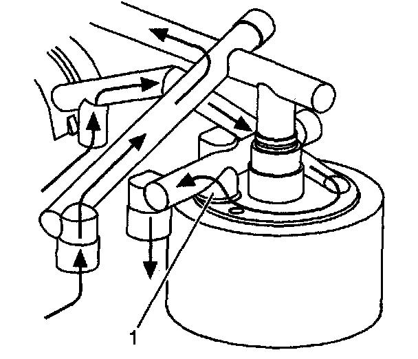 If the oil cooler flow becomes blocked, either from a plugged oil cooler or blocked or kinked oil cooler line, the oil cooler bypass valve (1) is forced open, allowing oil to flow directly into the engine oil passages. Oil does not flow into or out of the engine oil cooler.